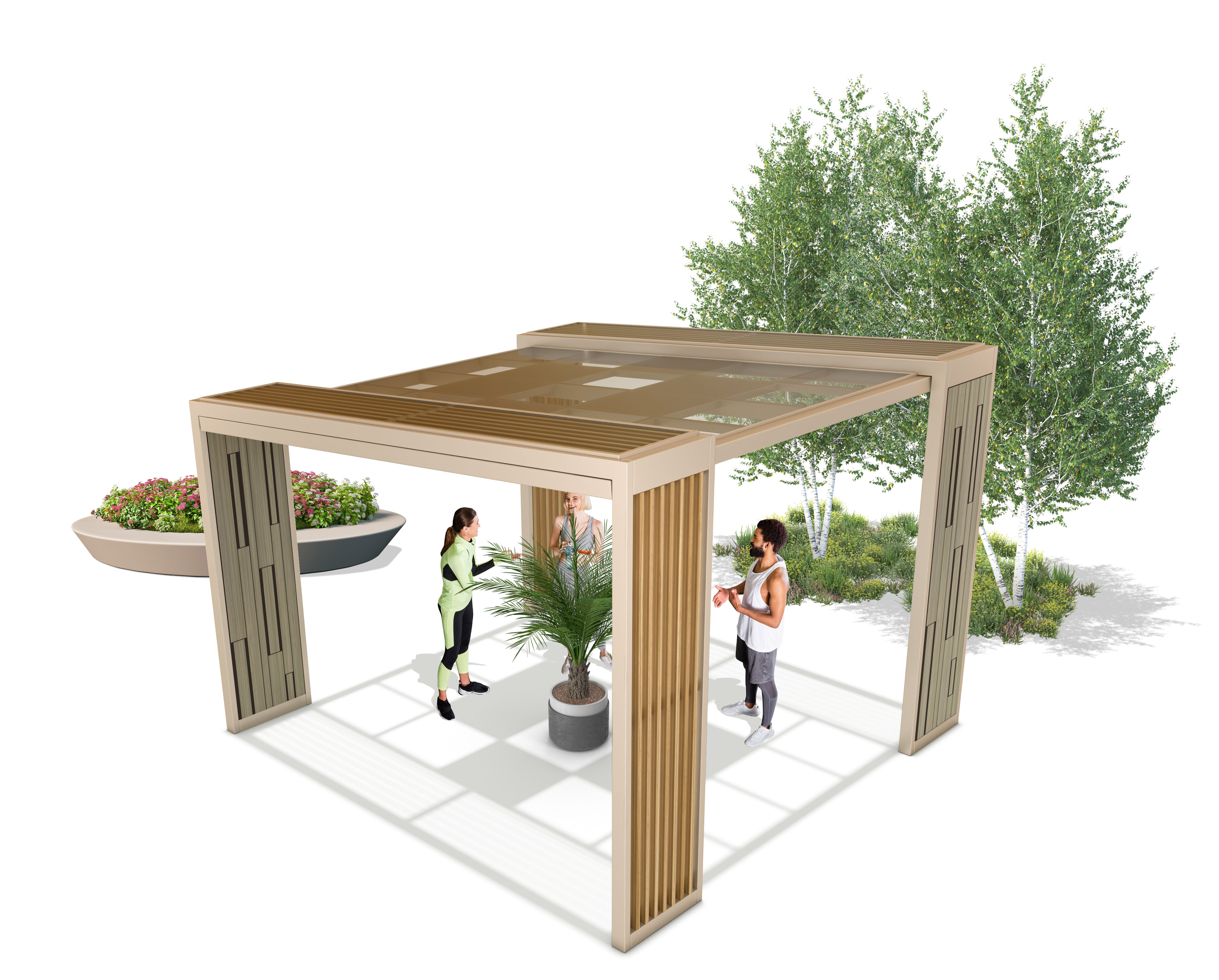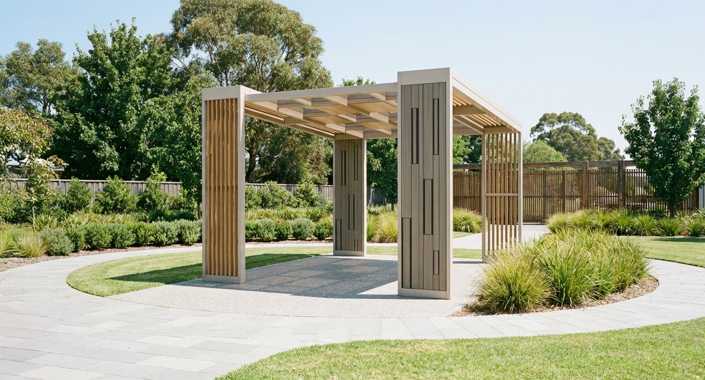 베이지 모듈 퍼걸러 (Beige Module Pergola)|GC-P-2118 제품목록으로 바로가기 자료 및 바로가기 나라장터 바로연결 도면 다운로드 시공사진 보러가기 기타 부드러운 베이지 톤과 우드 슬랫을 조합해 감성적이면서도 세련된 분위기를 담아낸 퍼걸러입니다. 기둥의 모듈형 패턴이 공간에 리듬감을 더하며, 공원·커뮤니티 공간에 자연스럽게 어우러집니다. 제품명 베이지 모듈 퍼걸러 (Beige Module Pergola)|GC-P-2118 물품식별번호 25615522 규격 4,000 × 4,000 × 2,880(H) 재질 stl, galvanized, polycarbonate, hard wood 베이지 모듈 퍼걸러 (Beige Module Pergola)|GC-P-2118 물품식별번호 25615522 규격 4,000 × 4,000 × 2,880(H) 재질 stl, galvanized, polycarbonate, hard wood 기타 부드러운 베이지 톤과 우드 슬랫을 조합해 감성적이면서도 세련된 분위기를 담아낸 퍼걸러입니다. 기둥의 모듈형 패턴이 공간에 리듬감을 더하며, 공원·커뮤니티 공간에 자연스럽게 어우러집니다. 자료 및 바로가기 나라장터 바로연결 도면 다운로드 시공사진 보러가기