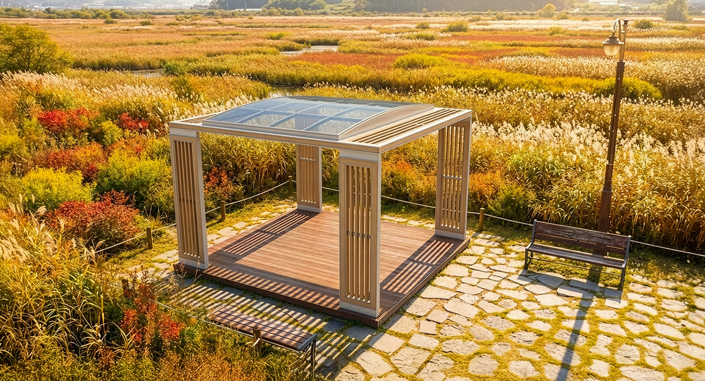 커브슬랫 퍼걸러 (Curve Slat Pergola)|GC-P-123B 제품목록으로 바로가기 자료 및 바로가기 나라장터 바로연결 도면 다운로드 시공사진 보러가기 기타 부드럽게 휘어진 루프와 세로 슬랫 기둥이 조화를 이루며 공원·단지 공간에 자연스러운 개방감과 따뜻한 분위기를 제공합니다. 심플한 구조 속에 우드 포인트를 더해 다양한 이용자에게 편안하고 현대적인 쉼터 경험을 제공합니다. 제품명 커브슬랫 퍼걸러 (Curve Slat Pergola)|GC-P-123B 물품식별번호 25636385 규격 4,000 × 4,000 × 2,800(H) 재질 stl, galvanized, hard wood, polycarbonate 커브슬랫 퍼걸러 (Curve Slat Pergola)|GC-P-123B 물품식별번호 25636385 규격 4,000 × 4,000 × 2,800(H) 재질 stl, galvanized, hard wood, polycarbonate 기타 부드럽게 휘어진 루프와 세로 슬랫 기둥이 조화를 이루며 공원·단지 공간에 자연스러운 개방감과 따뜻한 분위기를 제공합니다. 심플한 구조 속에 우드 포인트를 더해 다양한 이용자에게 편안하고 현대적인 쉼터 경험을 제공합니다. 자료 및 바로가기 나라장터 바로연결 도면 다운로드 시공사진 보러가기