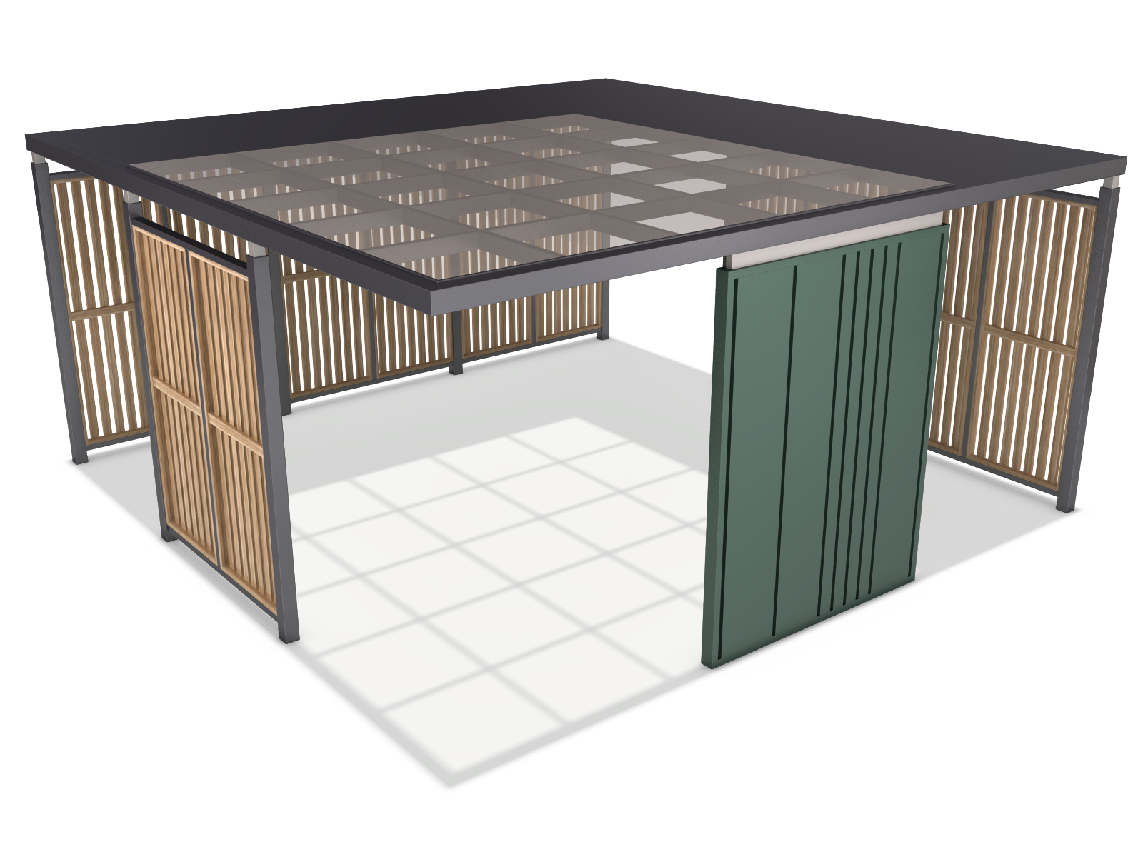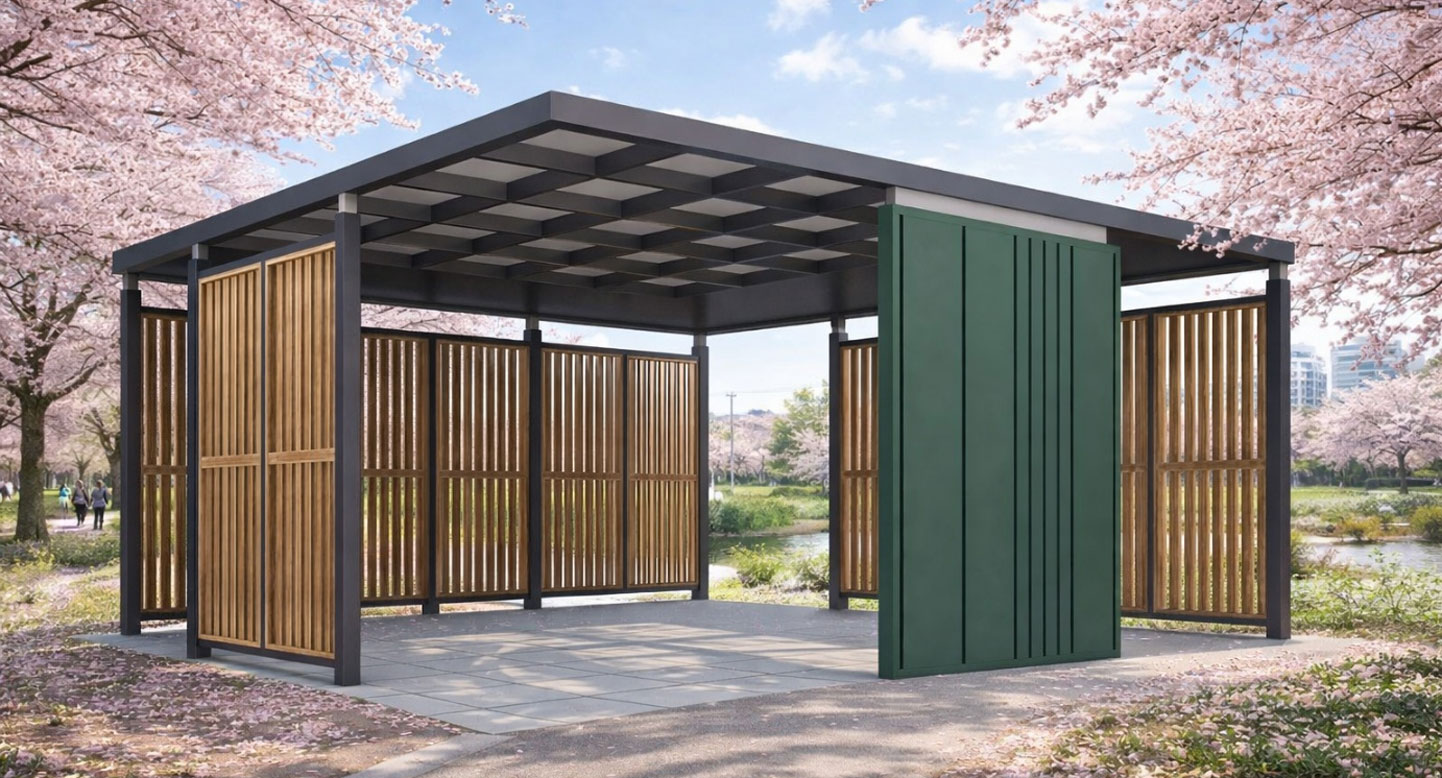 모듈 쉐이드 파빌리온 (Modular Shade Pavilion)|GC-P-763 제품목록으로 바로가기 자료 및 바로가기 나라장터 바로연결 도면 다운로드 시공사진 보러가기 기타 격자 지붕과 목재 루버로 자연광을 부드럽게 조절하며, 개방감과 아늑함을 동시에 제공하는 휴식형 파빌리온. 제품명 모듈 쉐이드 파빌리온 (Modular Shade Pavilion)|GC-P-763 물품식별번호 24752410 규격 6,000 × 6,000 × 2,825(H) 재질 stl, galvanized, polycarbonate, hard wood, hpl 모듈 쉐이드 파빌리온 (Modular Shade Pavilion)|GC-P-763 물품식별번호 24752410 규격 6,000 × 6,000 × 2,825(H) 재질 stl, galvanized, polycarbonate, hard wood, hpl 기타 격자 지붕과 목재 루버로 자연광을 부드럽게 조절하며, 개방감과 아늑함을 동시에 제공하는 휴식형 파빌리온. 자료 및 바로가기 나라장터 바로연결 도면 다운로드 시공사진 보러가기