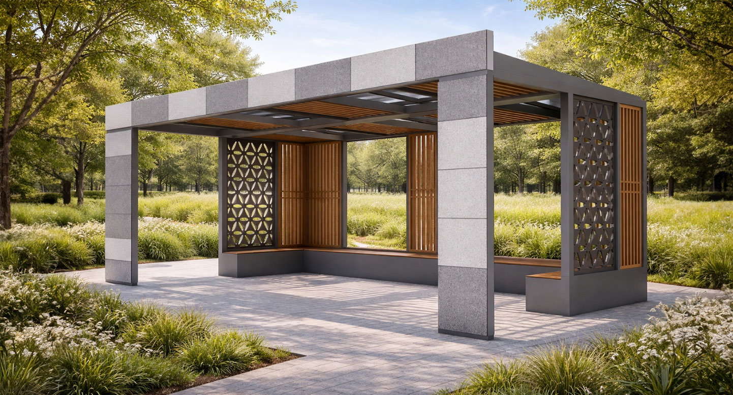 스톤 가든 쉼터 (Stone Garden Shelter)|GC-P-705B 제품목록으로 바로가기 자료 및 바로가기 나라장터 바로연결 도면 다운로드 시공사진 보러가기 기타 스톤 패널과 우드 슬랫을 조합해 자연 속에서 안정감 있는 휴식을 제공하는 쉼터로, 식재와 개방형 구조를 통해 산책·대화·휴식이 자연스럽게 이루어지는 정원형 커뮤니티 공간입니다. 제품명 스톤 가든 쉼터 (Stone Garden Shelter)|GC-P-705B 물품식별번호 25639121 규격 7,000 × 4,000 × 2,900(H) 재질 stl, galvanized, hard wood, polycarbonate, hpl, birch plywood 스톤 가든 쉼터 (Stone Garden Shelter)|GC-P-705B 물품식별번호 25639121 규격 7,000 × 4,000 × 2,900(H) 재질 stl, galvanized, hard wood, polycarbonate, hpl, birch plywood 기타 스톤 패널과 우드 슬랫을 조합해 자연 속에서 안정감 있는 휴식을 제공하는 쉼터로, 식재와 개방형 구조를 통해 산책·대화·휴식이 자연스럽게 이루어지는 정원형 커뮤니티 공간입니다. 자료 및 바로가기 나라장터 바로연결 도면 다운로드 시공사진 보러가기