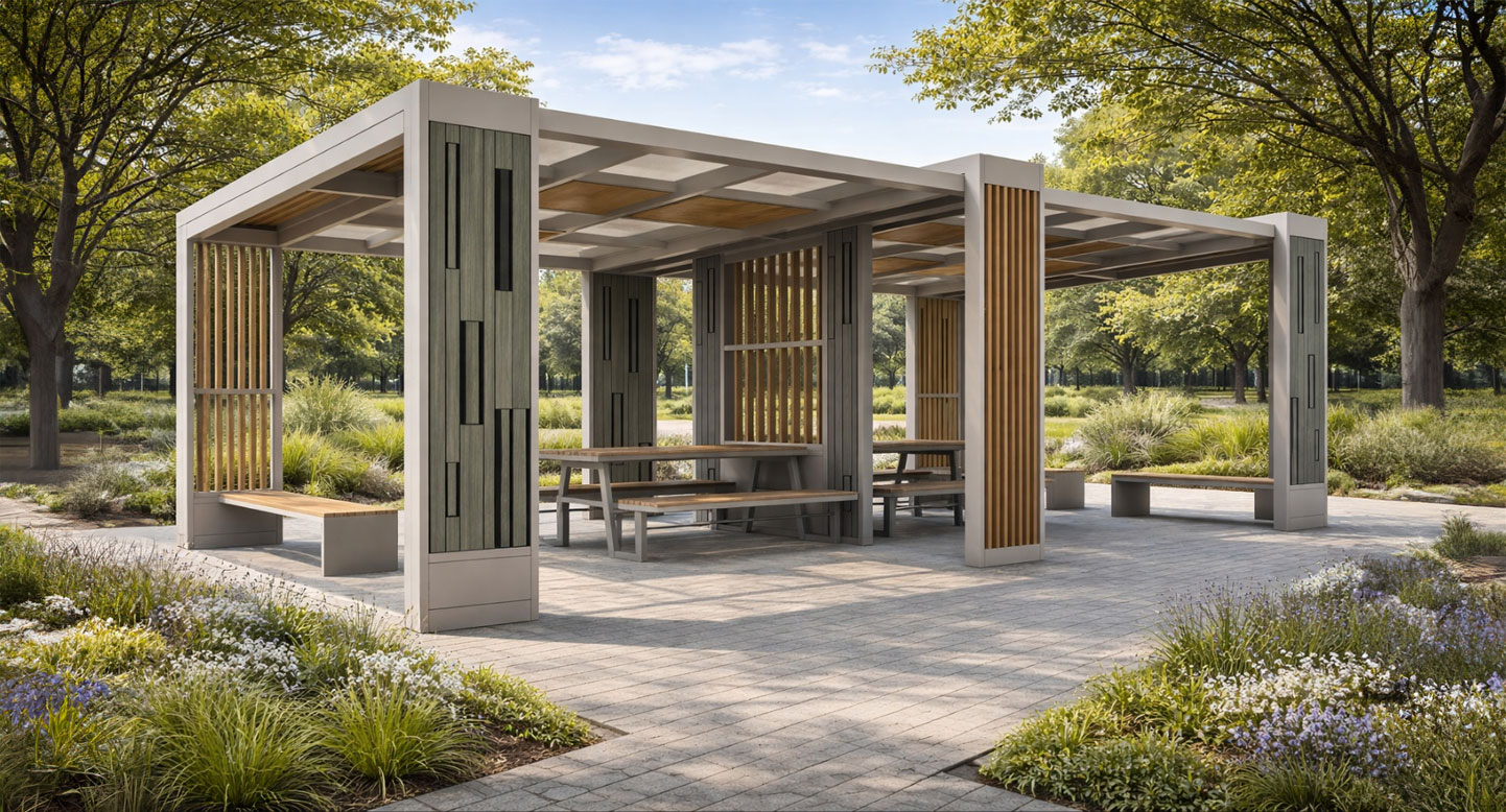 내추럴 라운지 쉼터 (Natural Lounge Shelter)|GC-P-1735 제품목록으로 바로가기 자료 및 바로가기 나라장터 바로연결 도면 다운로드 시공사진 보러가기 기타 우드 슬랫과 차분한 톤으로 안정된 분위기를 제공하며, 개방형 구조와 다양한 좌석 배치로 공원·단지에서 편안한 소통과 휴식을 지원하는 쉼터입니다. 제품명 내추럴 라운지 쉼터 (Natural Lounge Shelter)|GC-P-1735 물품식별번호 25651678 규격 7,300 × 4,000 × 2,880(H) 재질 stl, galvanized, polycarbonate, hard wood, hpl 내추럴 라운지 쉼터 (Natural Lounge Shelter)|GC-P-1735 물품식별번호 25651678 규격 7,300 × 4,000 × 2,880(H) 재질 stl, galvanized, polycarbonate, hard wood, hpl 기타 우드 슬랫과 차분한 톤으로 안정된 분위기를 제공하며, 개방형 구조와 다양한 좌석 배치로 공원·단지에서 편안한 소통과 휴식을 지원하는 쉼터입니다. 자료 및 바로가기 나라장터 바로연결 도면 다운로드 시공사진 보러가기