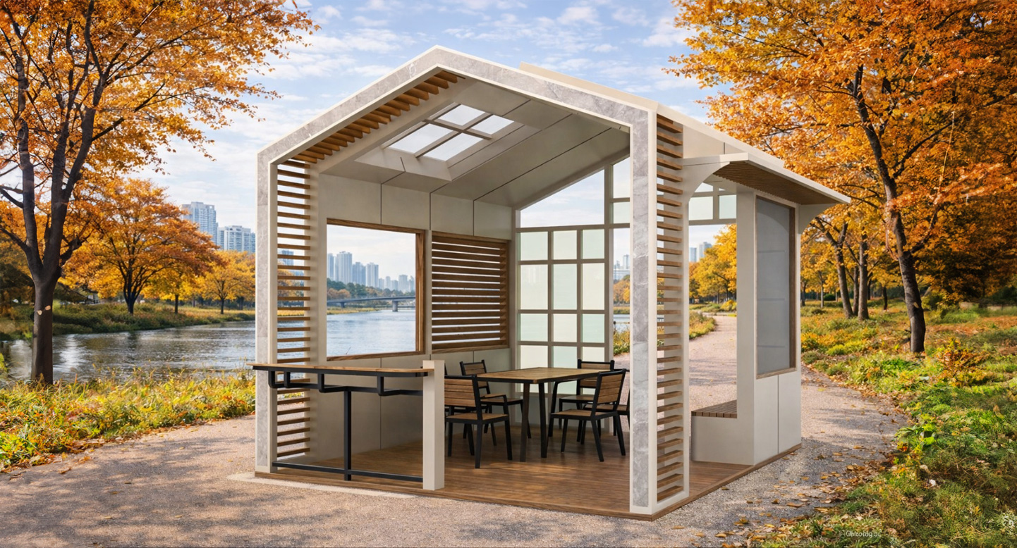 가든쉼 파빌리온 (Garden Shim Pavilion)|GC-P-1190 제품목록으로 바로가기 자료 및 바로가기 나라장터 바로연결 도면 다운로드 시공사진 보러가기 기타 목재 루버와 채광 구조를 적용한 자연형 쉼터로, 휴식과 소규모 커뮤니티 활동을 편안하게 지원합니다. 정원, 공원, 단지 공간에 조화롭게 어울리는 개방형 친환경 공간입니다. 제품명 가든쉼 파빌리온 (Garden Shim Pavilion)|GC-P-1190 물품식별번호 25565413 규격 4,000 × 4,320 × 3,500(H) 재질 stl, galvanized, polycarbonate, hard wood, hpl 가든쉼 파빌리온 (Garden Shim Pavilion)|GC-P-1190 물품식별번호 25565413 규격 4,000 × 4,320 × 3,500(H) 재질 stl, galvanized, polycarbonate, hard wood, hpl 기타 목재 루버와 채광 구조를 적용한 자연형 쉼터로, 휴식과 소규모 커뮤니티 활동을 편안하게 지원합니다. 정원, 공원, 단지 공간에 조화롭게 어울리는 개방형 친환경 공간입니다. 자료 및 바로가기 나라장터 바로연결 도면 다운로드 시공사진 보러가기