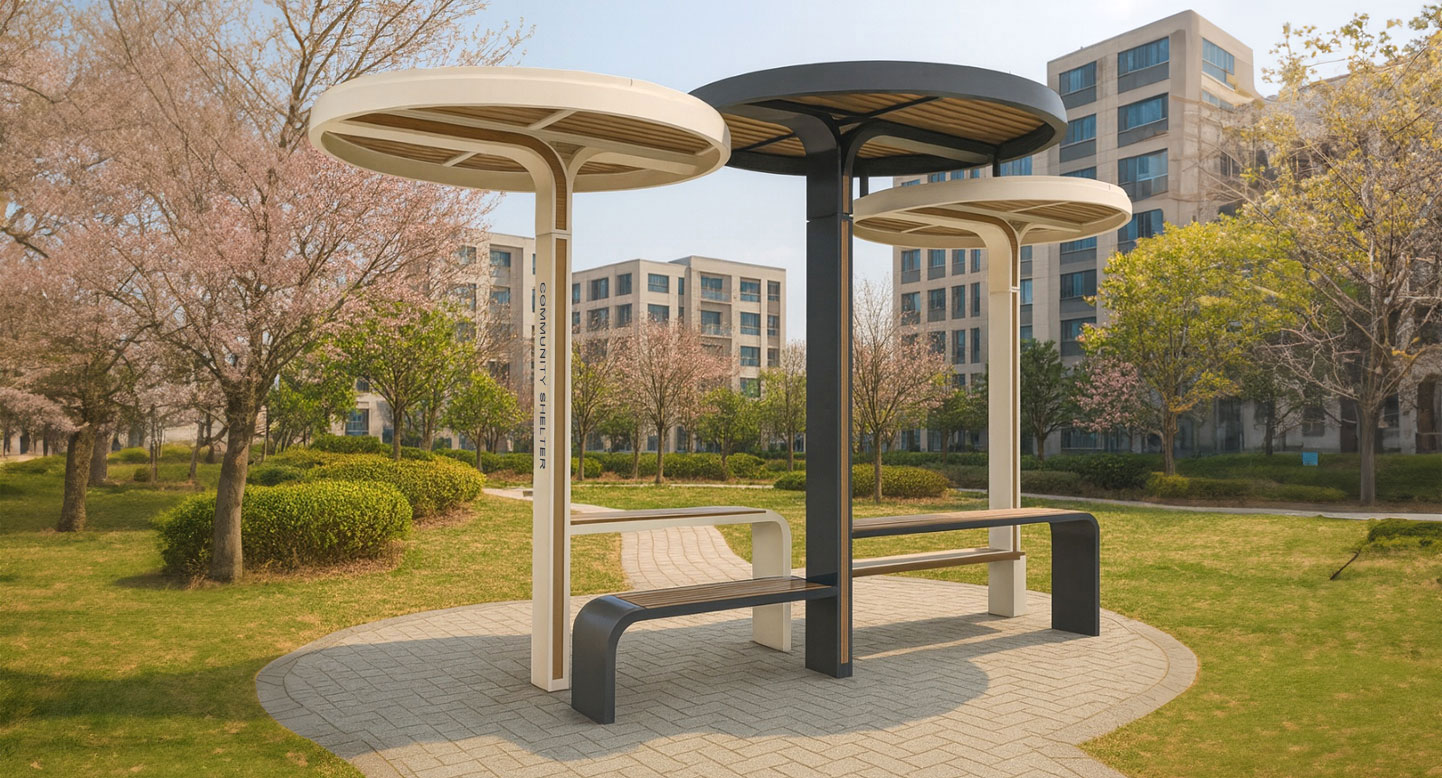 트리오 서클 쉼터 (Trio Circle Shelter)|GC-P-339 제품목록으로 바로가기 자료 및 바로가기 나라장터 바로연결 도면 다운로드 시공사진 보러가기 기타 세 개의 원형 캐노피가 겹치며 자연스러운 리듬감을 만들고, 우드 패턴 상부와 긴 벤치가 어우러져 사람들이 편안하게 모여 쉬고 소통할 수 있는 열린 커뮤니티 쉼터입니다. 제품명 트리오 서클 쉼터 (Trio Circle Shelter)|GC-P-339 물품식별번호 25565299 규격 6,400 × 3,000 × 3,050(H) 재질 stl, galvanized, polycarbonate, hard wood, hpl 트리오 서클 쉼터 (Trio Circle Shelter)|GC-P-339 물품식별번호 25565299 규격 6,400 × 3,000 × 3,050(H) 재질 stl, galvanized, polycarbonate, hard wood, hpl 기타 세 개의 원형 캐노피가 겹치며 자연스러운 리듬감을 만들고, 우드 패턴 상부와 긴 벤치가 어우러져 사람들이 편안하게 모여 쉬고 소통할 수 있는 열린 커뮤니티 쉼터입니다. 자료 및 바로가기 나라장터 바로연결 도면 다운로드 시공사진 보러가기