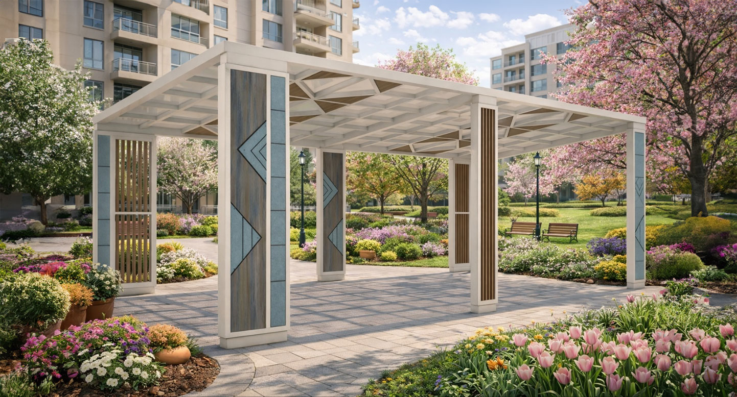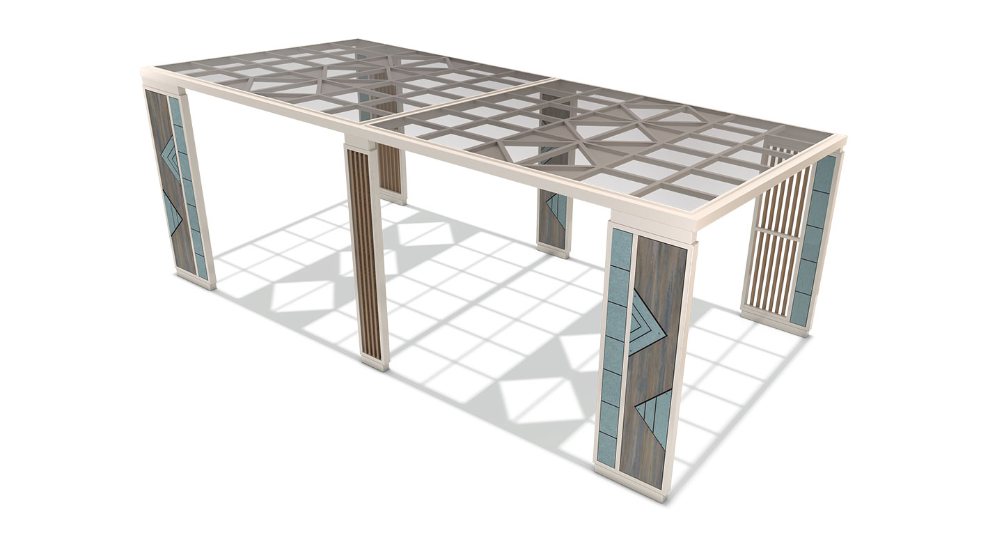 아쿠아 트라이앵글 퍼걸러 (Aqua Triangle Pergola)|GC-P-1729 제품목록으로 바로가기 자료 및 바로가기 나라장터 바로연결 도면 다운로드 시공사진 보러가기 기타 삼각 패턴과 아쿠아 컬러를 기둥에 적용해 산뜻하고 세련된 분위기를 연출한 쉼터입니다. 우드와 메탈의 조화로 공원, 산책로, 아파트 단지에 감각적인 휴식 공간을 제공합니다. 제품명 아쿠아 트라이앵글 퍼걸러 (Aqua Triangle Pergola)|GC-P-1729 물품식별번호 25615622 규격 7,600 × 3,800 × 2,865(H) 재질 stl, galvanized, polycarbonate, hard wood, hpl 아쿠아 트라이앵글 퍼걸러 (Aqua Triangle Pergola)|GC-P-1729 물품식별번호 25615622 규격 7,600 × 3,800 × 2,865(H) 재질 stl, galvanized, polycarbonate, hard wood, hpl 기타 삼각 패턴과 아쿠아 컬러를 기둥에 적용해 산뜻하고 세련된 분위기를 연출한 쉼터입니다. 우드와 메탈의 조화로 공원, 산책로, 아파트 단지에 감각적인 휴식 공간을 제공합니다. 자료 및 바로가기 나라장터 바로연결 도면 다운로드 시공사진 보러가기