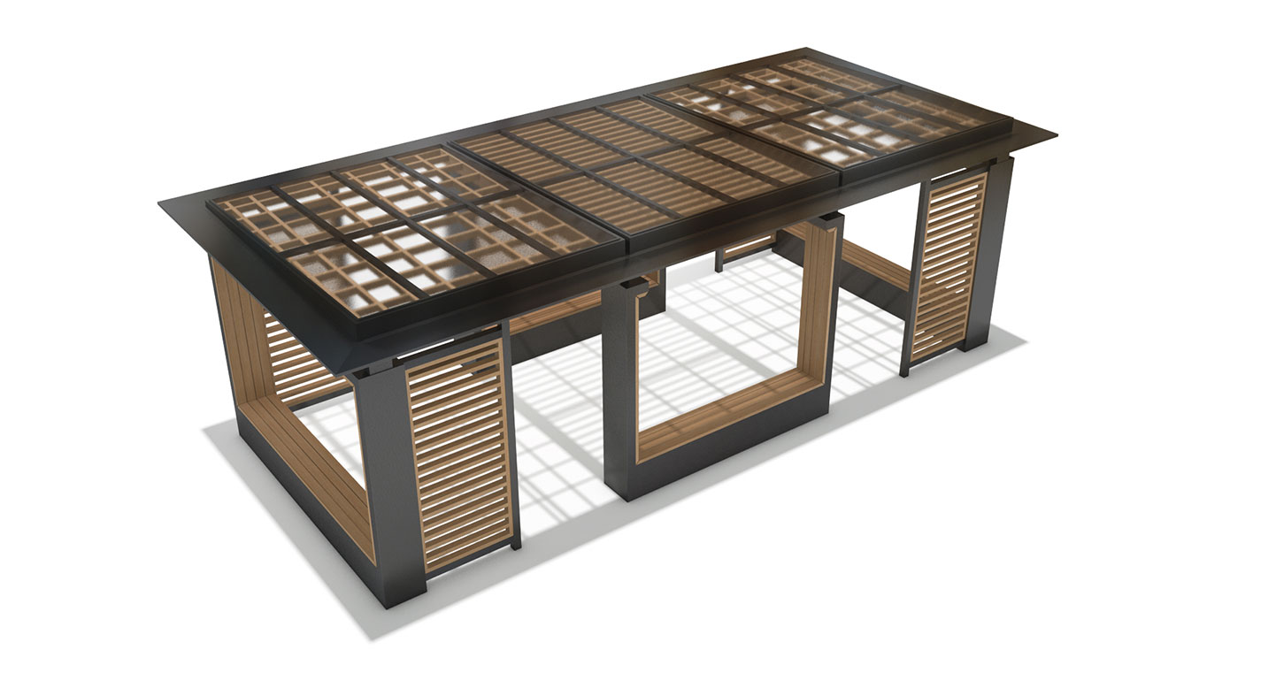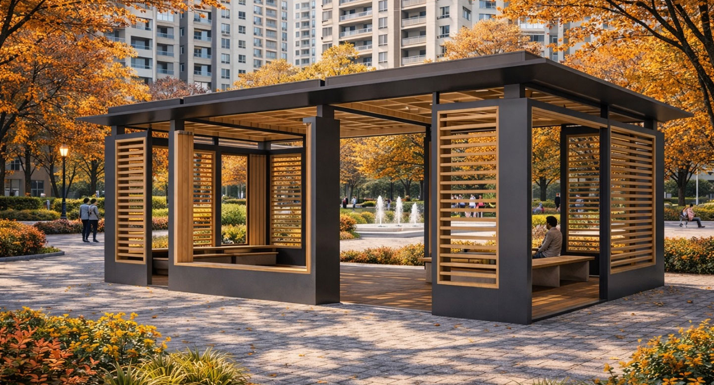 우드프레임 쉘터 (Wood Frame Shelter)|GGP-1008A 제품목록으로 바로가기 자료 및 바로가기 나라장터 바로연결 도면 다운로드 시공사진 보러가기 기타 루버 패턴의 우드 프레임과 견고한 메탈 구조를 조합해 따뜻함과 안정감을 담은 쉼터로, 다양한 개구부를 통해 자연광과 개방감을 확보해 공원·단지·산책로에서 편안하고 감각적인 휴식 공간을 제공합니다. 제품명 우드프레임 쉘터 (Wood Frame Shelter)|GGP-1008A 물품식별번호 25651515 규격 7,500 × 3,600 × 2,800(H) 재질 stl, galvanized, hard wood, polycarbonate 우드프레임 쉘터 (Wood Frame Shelter)|GGP-1008A 물품식별번호 25651515 규격 7,500 × 3,600 × 2,800(H) 재질 stl, galvanized, hard wood, polycarbonate 기타 루버 패턴의 우드 프레임과 견고한 메탈 구조를 조합해 따뜻함과 안정감을 담은 쉼터로, 다양한 개구부를 통해 자연광과 개방감을 확보해 공원·단지·산책로에서 편안하고 감각적인 휴식 공간을 제공합니다. 자료 및 바로가기 나라장터 바로연결 도면 다운로드 시공사진 보러가기