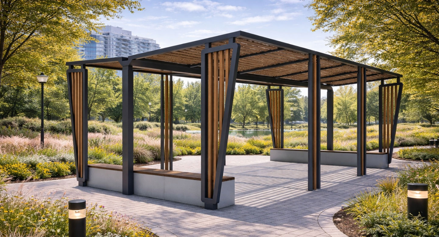 슬림 루버 파빌리온 (Slim Louver Pavilion)|GC-P-1712 제품목록으로 바로가기 자료 및 바로가기 나라장터 바로연결 도면 다운로드 시공사진 보러가기 기타 슬림한 루버 기둥과 플랫 지붕으로 개방감을 강조한 쉼터로, 양측 벤치와 통풍형 차양이 공원·캠퍼스·단지에서 편안한 휴식 환경을 제공합니다. 제품명 슬림 루버 파빌리온 (Slim Louver Pavilion)|GC-P-1712 물품식별번호 25615548 규격 12,160 × 4,000 × 3,000(H) 재질 stl, galvanized, polycarbonate, hard wood 슬림 루버 파빌리온 (Slim Louver Pavilion)|GC-P-1712 물품식별번호 25615548 규격 12,160 × 4,000 × 3,000(H) 재질 stl, galvanized, polycarbonate, hard wood 기타 슬림한 루버 기둥과 플랫 지붕으로 개방감을 강조한 쉼터로, 양측 벤치와 통풍형 차양이 공원·캠퍼스·단지에서 편안한 휴식 환경을 제공합니다. 자료 및 바로가기 나라장터 바로연결 도면 다운로드 시공사진 보러가기