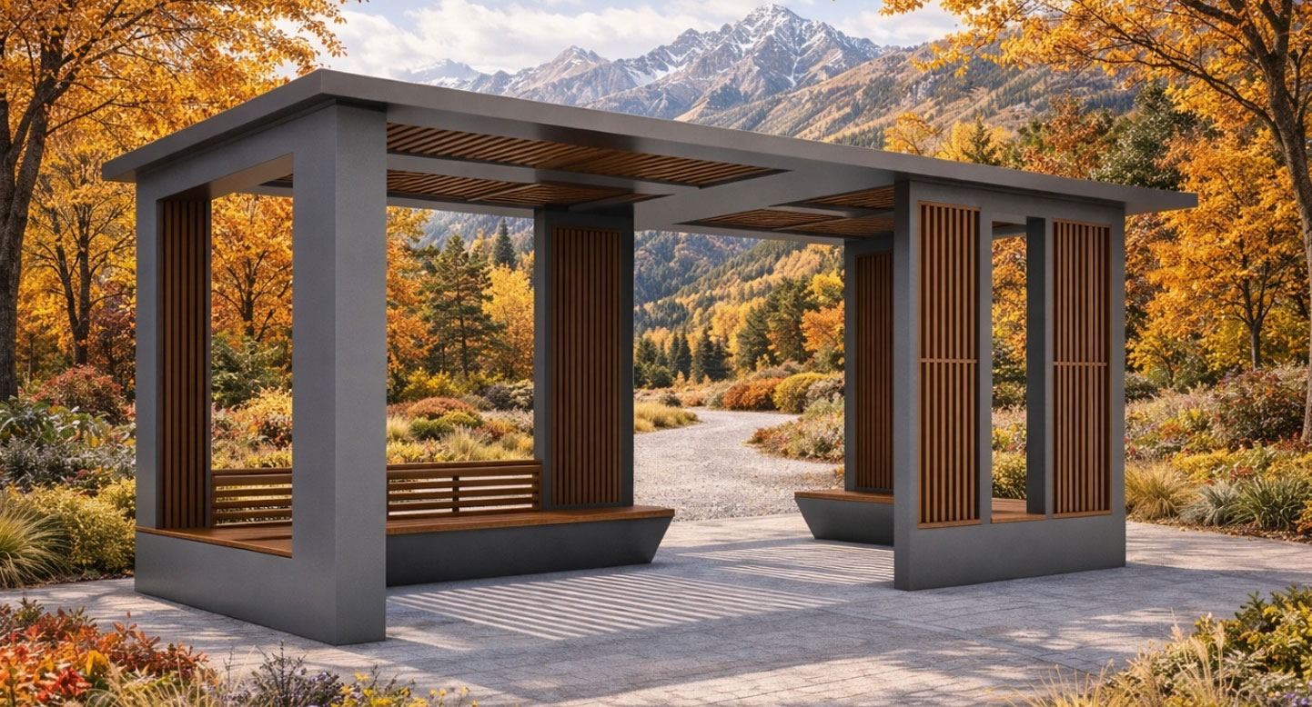 루버 쉼 파빌리온 (Louver Shim Pavilion)|GC-P-708A 제품목록으로 바로가기 자료 및 바로가기 나라장터 바로연결 도면 다운로드 시공사진 보러가기 기타 일체형 벤치와 루버 기둥을 조합해 시선 차단과 편안한 휴식을 동시에 제공하는 쉼터로, 공원·단지·캠퍼스에서 자연스럽게 머물고 소통할 수 있는 공간입니다. 제품명 루버 쉼 파빌리온 (Louver Shim Pavilion)|GC-P-708A 물품식별번호 25639124 규격 8,000 × 4,000 × 2,800(H) 재질 stl, galvanized, hard wood, polycarbonate 루버 쉼 파빌리온 (Louver Shim Pavilion)|GC-P-708A 물품식별번호 25639124 규격 8,000 × 4,000 × 2,800(H) 재질 stl, galvanized, hard wood, polycarbonate 기타 일체형 벤치와 루버 기둥을 조합해 시선 차단과 편안한 휴식을 동시에 제공하는 쉼터로, 공원·단지·캠퍼스에서 자연스럽게 머물고 소통할 수 있는 공간입니다. 자료 및 바로가기 나라장터 바로연결 도면 다운로드 시공사진 보러가기