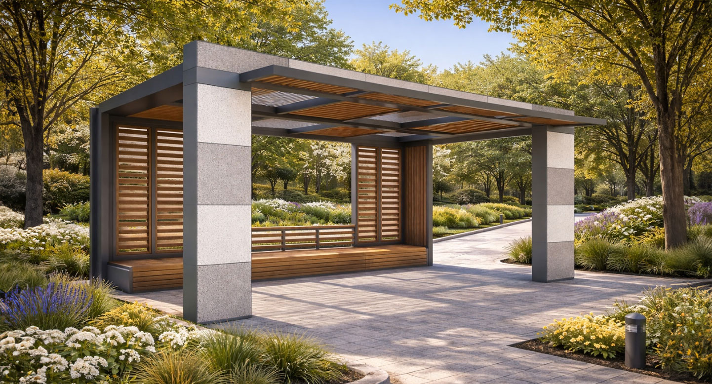 스톤 루버 파빌리온 (Stone Louver Pavilion)|GC-P-715A 제품목록으로 바로가기 자료 및 바로가기 나라장터 바로연결 도면 다운로드 시공사진 보러가기 기타 대형 스톤 패널과 루버 차양을 조합해 안정감과 개방감을 동시에 제공하는, 공원·단지에서 편안한 휴식과 만남을 지원하는 쉼터입니다. 제품명 스톤 루버 파빌리온 (Stone Louver Pavilion)|GC-P-715A 물품식별번호 25639131 규격 6,000 × 3,700 × 3,100(H) 재질 stl, galvanized, hard wood, polycarbonate 스톤 루버 파빌리온 (Stone Louver Pavilion)|GC-P-715A 물품식별번호 25639131 규격 6,000 × 3,700 × 3,100(H) 재질 stl, galvanized, hard wood, polycarbonate 기타 대형 스톤 패널과 루버 차양을 조합해 안정감과 개방감을 동시에 제공하는, 공원·단지에서 편안한 휴식과 만남을 지원하는 쉼터입니다. 자료 및 바로가기 나라장터 바로연결 도면 다운로드 시공사진 보러가기