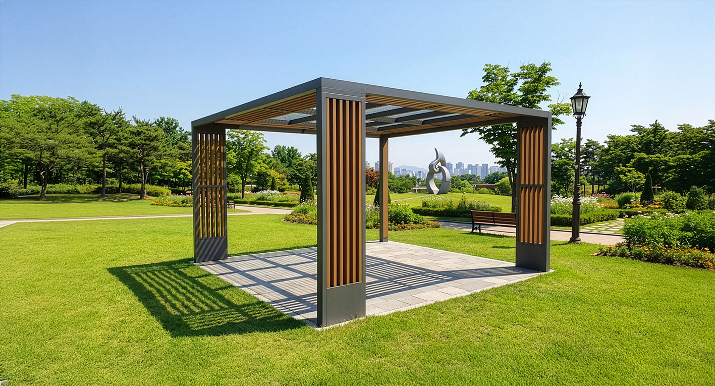 모던 우드큐브 퍼걸러(Modern Wood Cube Pergola)|GC-P-111B 제품목록으로 바로가기 자료 및 바로가기 나라장터 바로연결 도면 다운로드 시공사진 보러가기 기타 모던한 사각 프레임에 우드 슬랫을 더해 단지·공원 어디서나 고급스러운 분위기를 연출하는 퍼걸러입니다. 제품명 모던 우드큐브 퍼걸러(Modern Wood Cube Pergola)|GC-P-111B 물품식별번호 25651487 규격 4,000 × 4,000 × 2,600(H) 재질 stl, galvanized, hard wood, polycarbonate 모던 우드큐브 퍼걸러(Modern Wood Cube Pergola)|GC-P-111B 물품식별번호 25651487 규격 4,000 × 4,000 × 2,600(H) 재질 stl, galvanized, hard wood, polycarbonate 기타 모던한 사각 프레임에 우드 슬랫을 더해 단지·공원 어디서나 고급스러운 분위기를 연출하는 퍼걸러입니다. 자료 및 바로가기 나라장터 바로연결 도면 다운로드 시공사진 보러가기