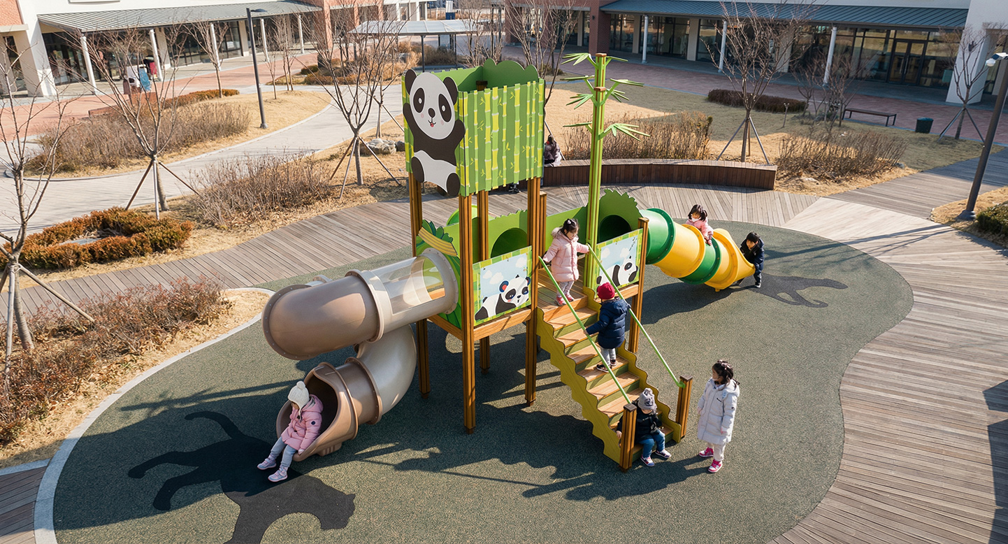 판다 브릿지 플레이존 (Panda Bridge Playzone)|GGPG-011-8 제품목록으로 바로가기 자료 및 바로가기 나라장터 바로연결 도면 다운로드 시공사진 보러가기 기타 판다와 대나무 숲을 따라 이동하는 브릿지형 놀이 공간으로 디자인 하였습니다. 슬라이드와 계단, 연결 데크를 단순한 동선으로 구성해 아이들이 자연스럽게 오르고 내려오며 신체 활동과 탐험 놀이를 즐길 수 있도록 의도하였습니다. 제품명 판다 브릿지 플레이존 (Panda Bridge Playzone)|GGPG-011-8 물품식별번호 25438427|안전인증번호:CA023H10019-3022 규격 8,761 x 3,896 x 4,390(H), 4종 재질 stl, hpl, pe, hard wood 판다 브릿지 플레이존 (Panda Bridge Playzone)|GGPG-011-8 물품식별번호 25438427|안전인증번호:CA023H10019-3022 규격 8,761 x 3,896 x 4,390(H), 4종 재질 stl, hpl, pe, hard wood 기타 판다와 대나무 숲을 따라 이동하는 브릿지형 놀이 공간으로 디자인 하였습니다. 슬라이드와 계단, 연결 데크를 단순한 동선으로 구성해 아이들이 자연스럽게 오르고 내려오며 신체 활동과 탐험 놀이를 즐길 수 있도록 의도하였습니다. 자료 및 바로가기 나라장터 바로연결 도면 다운로드 시공사진 보러가기
