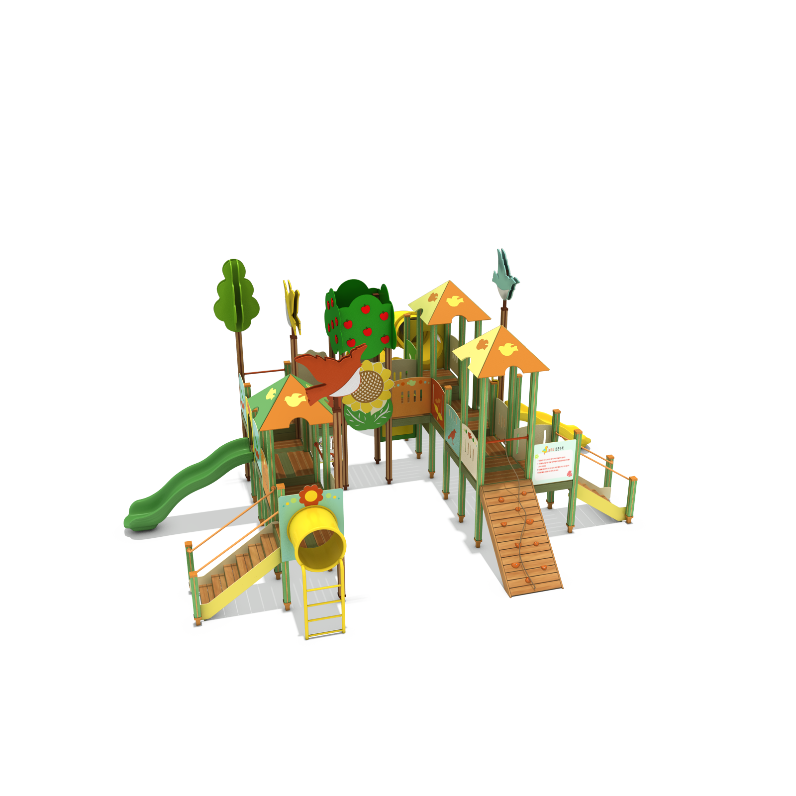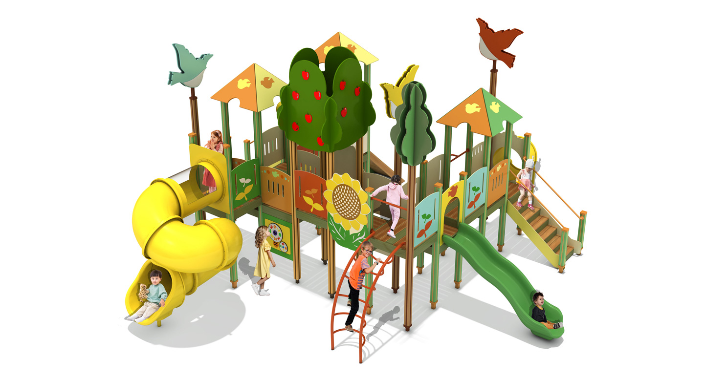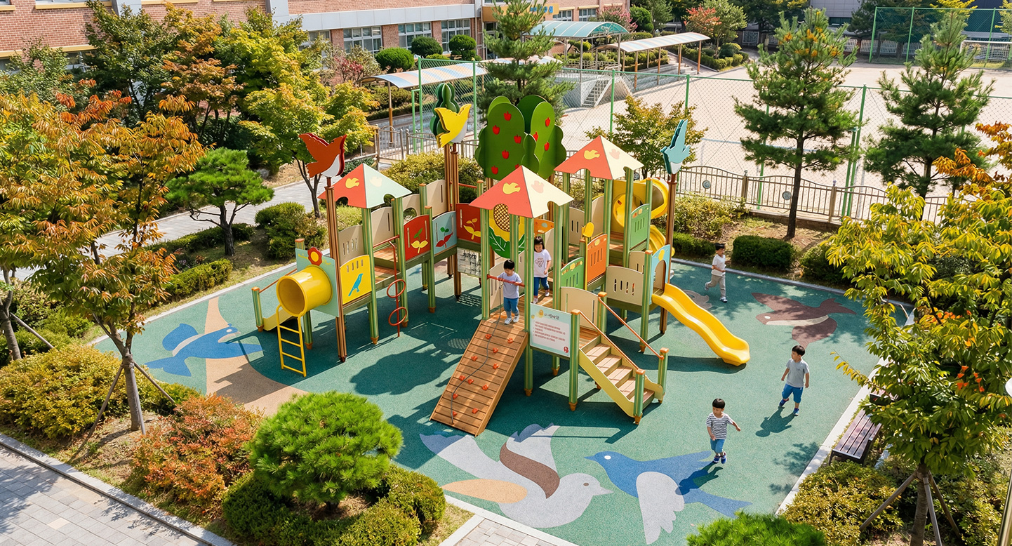 해피 가든 플레이빌리지 (Happy Garden Play Village)|GGPG-004A-3 제품목록으로 바로가기 자료 및 바로가기 나라장터 바로연결 도면 다운로드 시공사진 보러가기 기타 과일나무와 해바라기, 새가 어우러진 밝은 정원 마을을 모티브로, 다층 데크와 브릿지·오르기·슬라이드를 풍부하게 연결해 아이들이 정원을 산책하듯 이동하며 탐험·교류·상상 놀이를 자연스럽게 즐기는 가든형 조합놀이시설입니다. 제품명 해피 가든 플레이빌리지 (Happy Garden Play Village)|GGPG-004A-3 물품식별번호 25988108|안전인증번호:CA023H10019-3024 규격 9,950 × 8,241 × 4,300(H), 12종 재질 stl, hpl, pe, hard wood 해피 가든 플레이빌리지 (Happy Garden Play Village)|GGPG-004A-3 물품식별번호 25988108|안전인증번호:CA023H10019-3024 규격 9,950 × 8,241 × 4,300(H), 12종 재질 stl, hpl, pe, hard wood 기타 과일나무와 해바라기, 새가 어우러진 밝은 정원 마을을 모티브로, 다층 데크와 브릿지·오르기·슬라이드를 풍부하게 연결해 아이들이 정원을 산책하듯 이동하며 탐험·교류·상상 놀이를 자연스럽게 즐기는 가든형 조합놀이시설입니다. 자료 및 바로가기 나라장터 바로연결 도면 다운로드 시공사진 보러가기