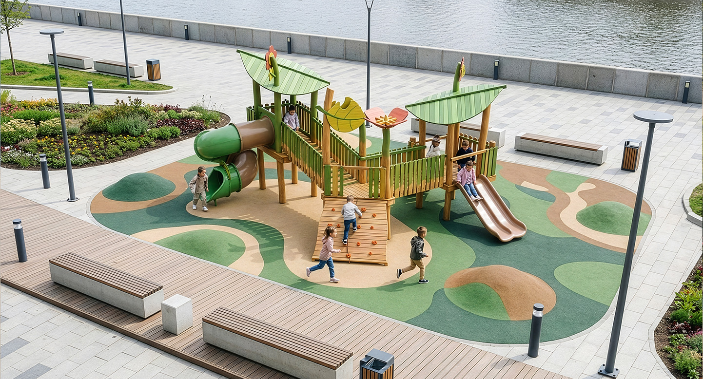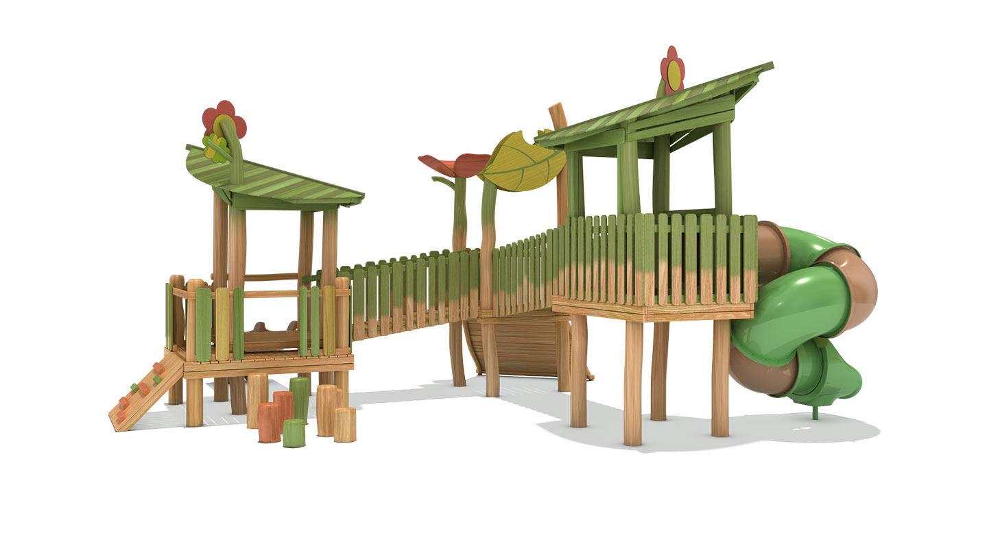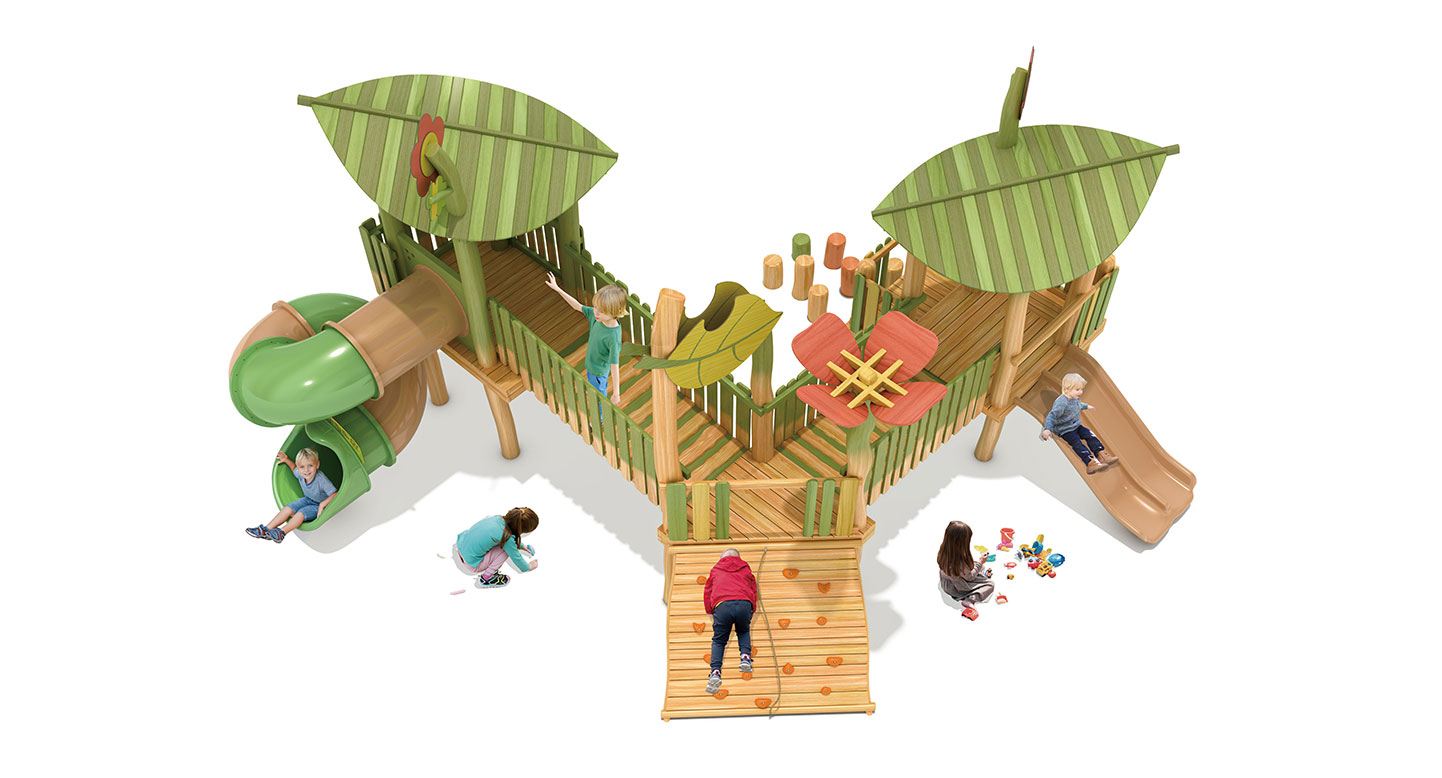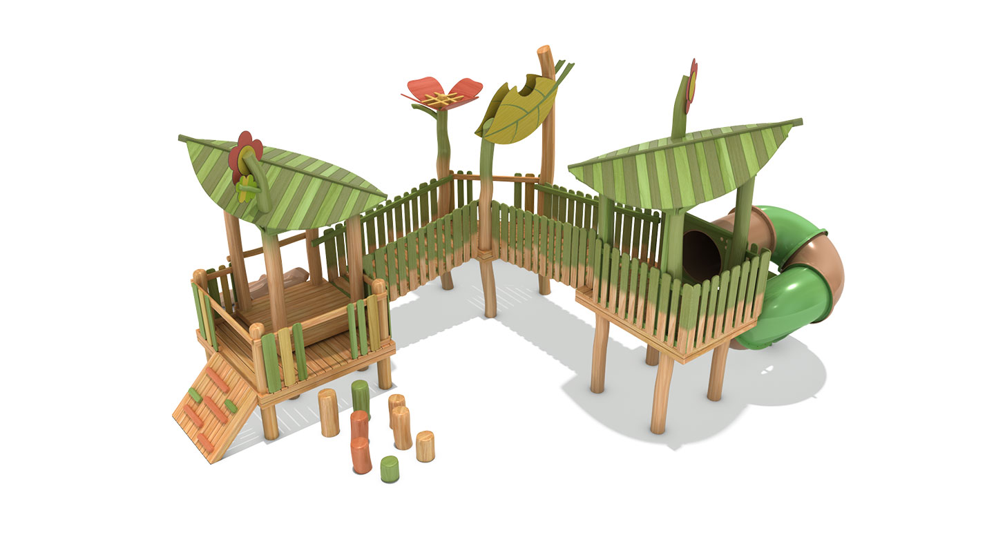 로비니아 원목으로 제작한 두 개의 잎사귀 쉼터를 데크로 연결해 아이들이 걷고 건너며 이동하도록 구성한 로비니아 조합놀이대이다. 오르기 경사면과 미끄럼틀을 함께 배치해 자연 속 숲길을 탐험하듯 균형감과 신체 활동, 상상 놀이를 자연스럽게 유도하도록 설계되었다.