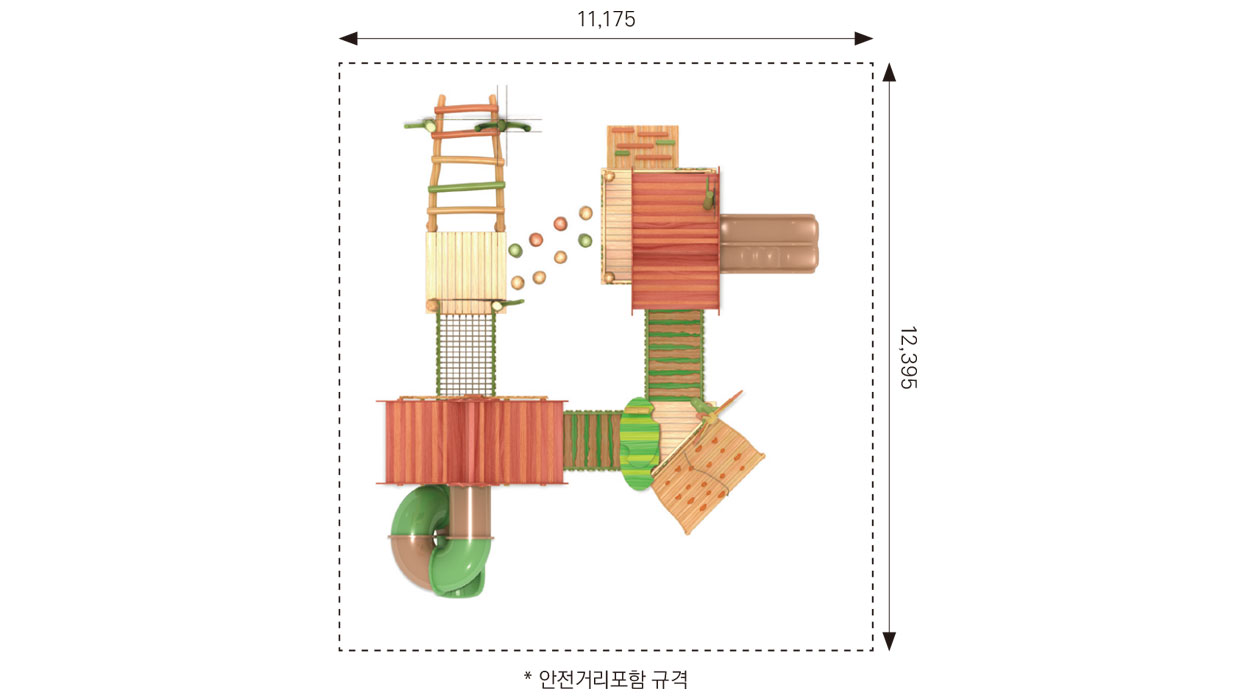 로비니아 원목의 따뜻한 질감과 숲속 오두막·풍차 모티브를 결합해 데크와 브리지를 따라 걷고 건너며 자연을 체험하도록 구성한 로비니아 조합놀이대이다. 자연 지형을 닮은 높이 변화와 오르기 요소로 균형감·탐험성을 키우는 숲속 마을형 놀이공간을 구현했다.