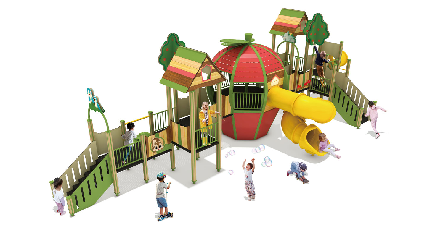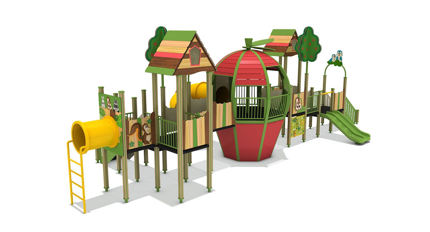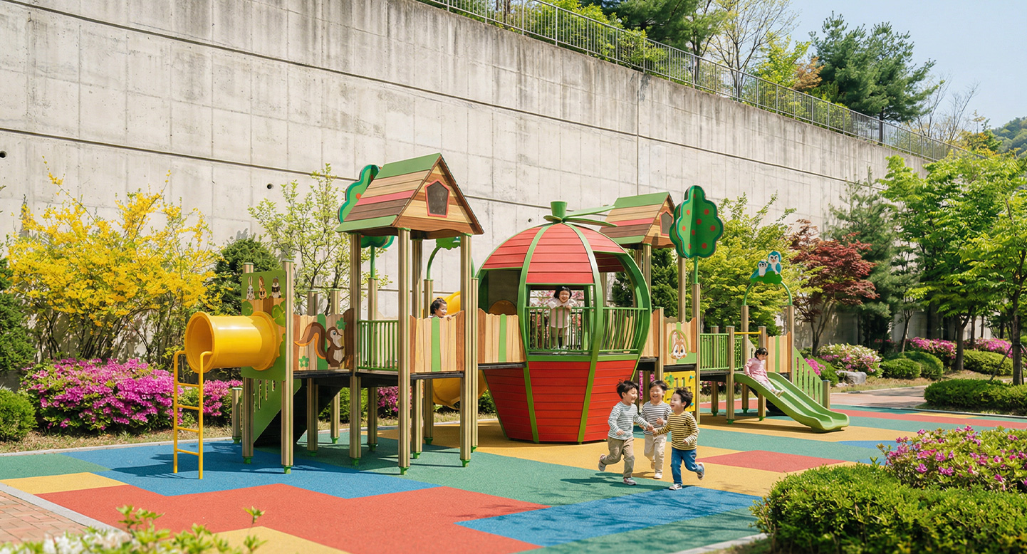 애플 포레스트 플레이어드벤처(Apple Forest Players Venture)|FNK-041B-2 제품목록으로 바로가기 자료 및 바로가기 나라장터 바로연결 도면 다운로드 시공사진 보러가기 기타 사과를 형상화한 중앙 돔과 숲속 오두막형 데크를 연결해 오르기·이동·미끄러지기 놀이가 하나의 동선으로 이어지도록 구성한 조합 놀이시설이다. 제품명 애플 포레스트 플레이어드벤처(Apple Forest Players Venture)|FNK-041B-2 물품식별번호 25988176|안전인증번호:CA023H10019-3014 규격 12,848 × 5,844 × 4,440(H), 5종 재질 stl, hpl, pe, hard wood 애플 포레스트 플레이어드벤처(Apple Forest Players Venture)|FNK-041B-2 물품식별번호 25988176|안전인증번호:CA023H10019-3014 규격 12,848 × 5,844 × 4,440(H), 5종 재질 stl, hpl, pe, hard wood 기타 사과를 형상화한 중앙 돔과 숲속 오두막형 데크를 연결해 오르기·이동·미끄러지기 놀이가 하나의 동선으로 이어지도록 구성한 조합 놀이시설이다. 자료 및 바로가기 나라장터 바로연결 도면 다운로드 시공사진 보러가기