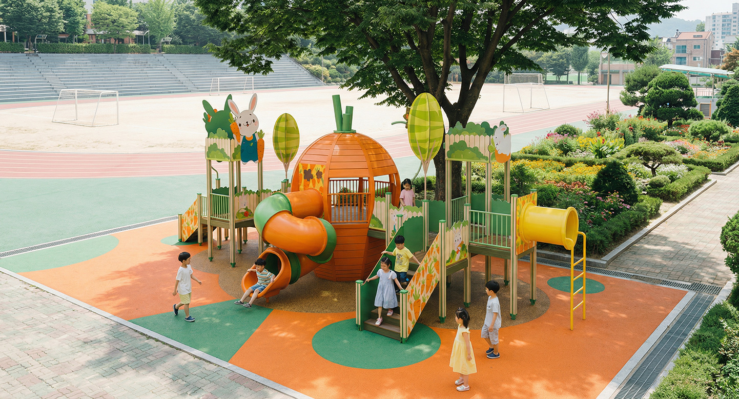 래빗 캐럿 어드벤처(Rabbit Carrot Adventure)|GGPG-014-1 제품목록으로 바로가기 자료 및 바로가기 나라장터 바로연결 도면 다운로드 시공사진 보러가기 기타 당근을 형상화한 중심 놀이 구조와 토끼·숲 그래픽을 결합해 아이들이 오르고 이동하며 미끄러지는 놀이 흐름을 자연스럽게 경험하도록 구성한 조합 놀이시설이다. 제품명 래빗 캐럿 어드벤처(Rabbit Carrot Adventure)|GGPG-014-1 물품식별번호 25436915|안전인증번호:CA023H10019-3014 규격 12,938 x 5,844 x 4,920(H), 6종 재질 stl, hpl, pe, hard wood 래빗 캐럿 어드벤처(Rabbit Carrot Adventure)|GGPG-014-1 물품식별번호 25436915|안전인증번호:CA023H10019-3014 규격 12,938 x 5,844 x 4,920(H), 6종 재질 stl, hpl, pe, hard wood 기타 당근을 형상화한 중심 놀이 구조와 토끼·숲 그래픽을 결합해 아이들이 오르고 이동하며 미끄러지는 놀이 흐름을 자연스럽게 경험하도록 구성한 조합 놀이시설이다. 자료 및 바로가기 나라장터 바로연결 도면 다운로드 시공사진 보러가기