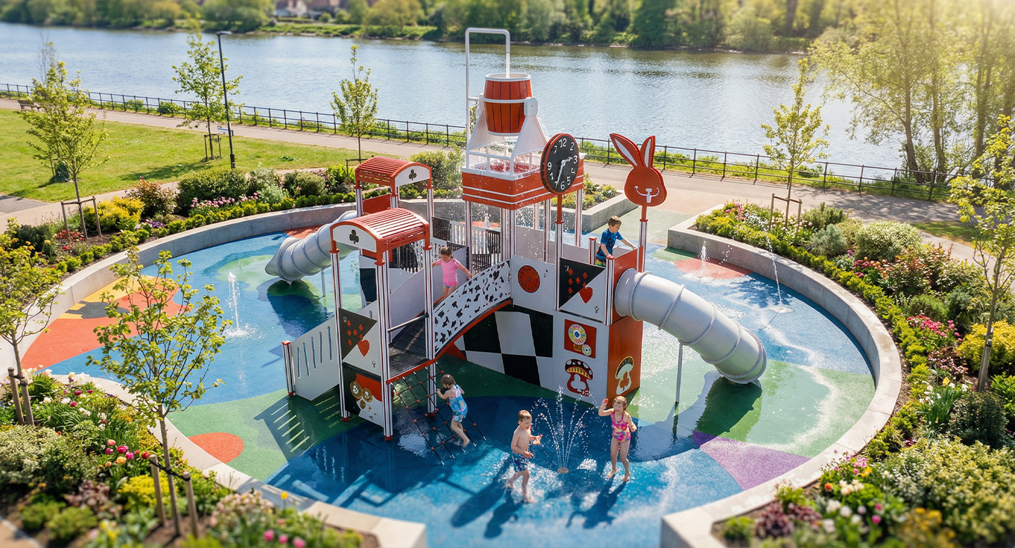 카드 패턴과 시계 타워를 모티브로 한 구조에 워터버킷 낙수와 분사형 물놀이 요소, 터널형 미끄럼틀을 결합한 물놀이 조합놀이대이다. 오르기·이동·미끄러지기 동선에 물의 흐름이 연계되어 아이들이 물을 맞고 피하며 놀이하도록 설계해, 여름철 신체 활동과 감각 자극, 놀이 몰입도를 동시에 높이는 물놀이 특화 시설이다.