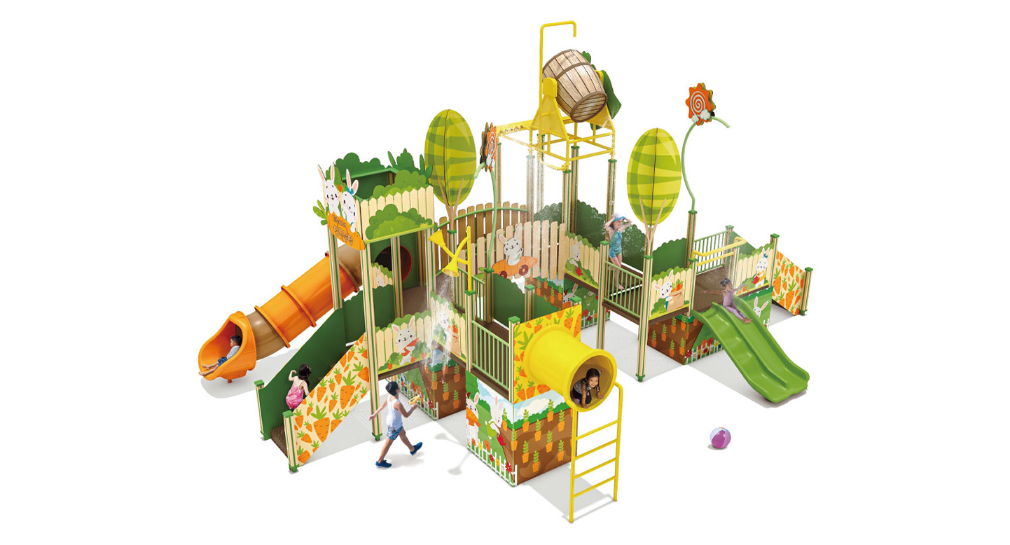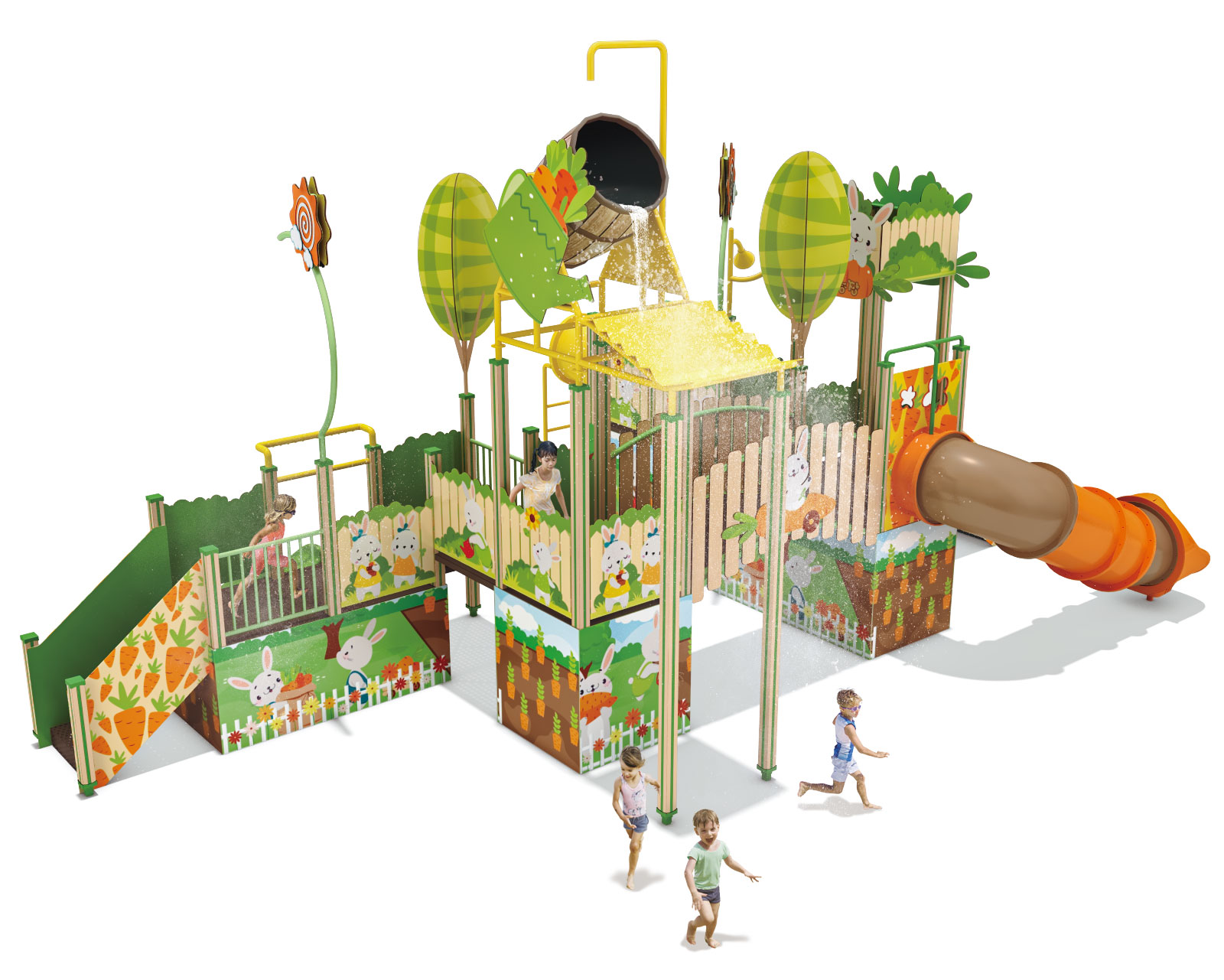 당근 밭과 숲 친구를 모티브로 한 구조에 워터버킷 낙수와 분사형 물놀이 요소, 터널형 미끄럼틀을 결합한 물놀이 조합놀이대이다. 오르기·이동·미끄러지기 동선 곳곳에서 물의 흐름을 직접 체험하도록 구성해 여름철 더위 완화와 함께 신체 활동·감각 자극을 자연스럽게 유도하는 물놀이 특화 놀이시설이다.
