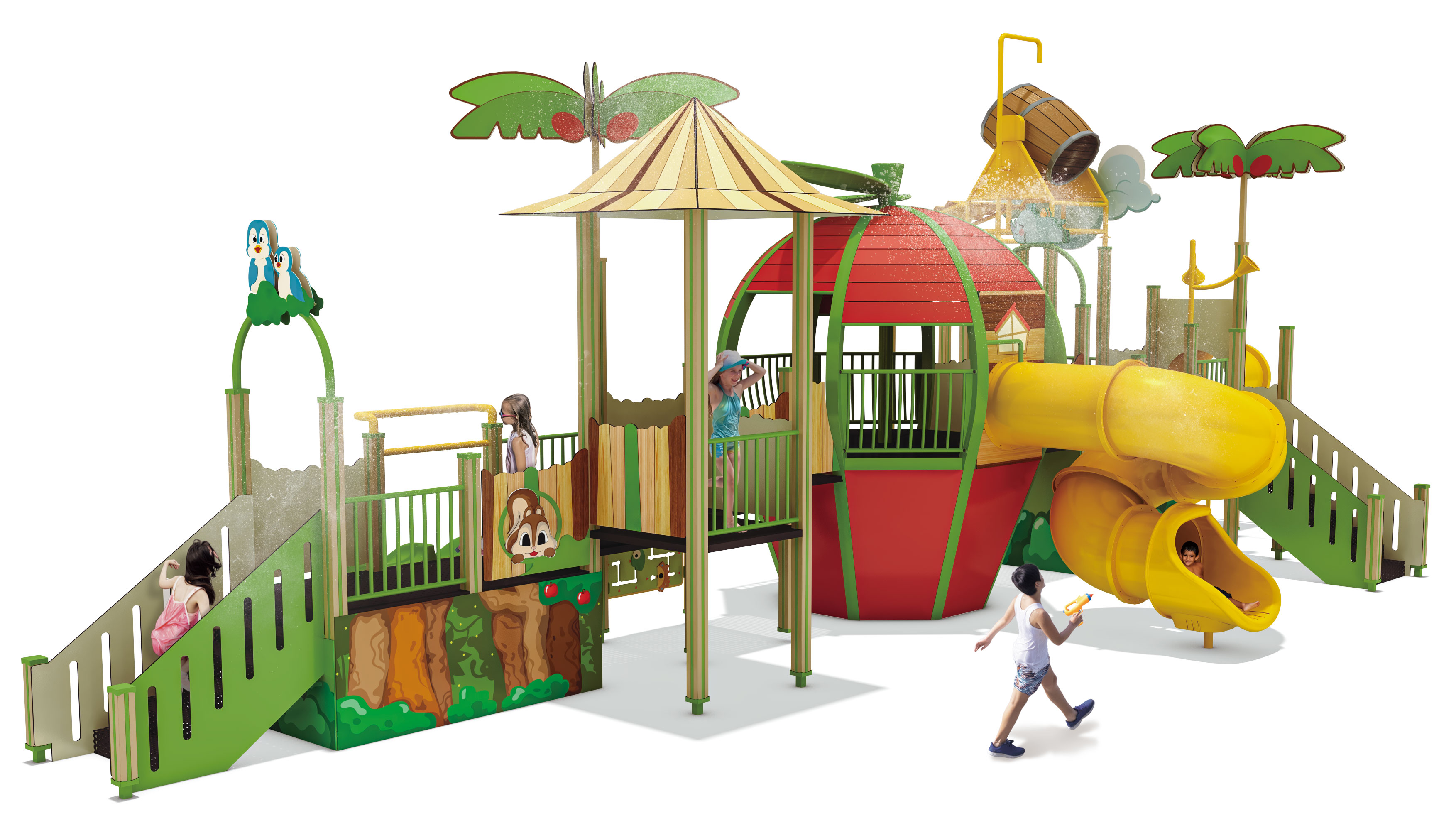 열대 과일과 정글을 모티브로 한 구조에 워터버킷 낙수, 분사형 워터 스프레이, 터널형 미끄럼틀을 결합한 물놀이 조합놀이대로, 아이들이 오르기·이동·미끄러지기 놀이 과정에서 물의 떨어짐과 흐름을 직접 체험하며 여름철 신체 활동과 감각 놀이를 동시에 즐길 수 있도록 구성하였다.