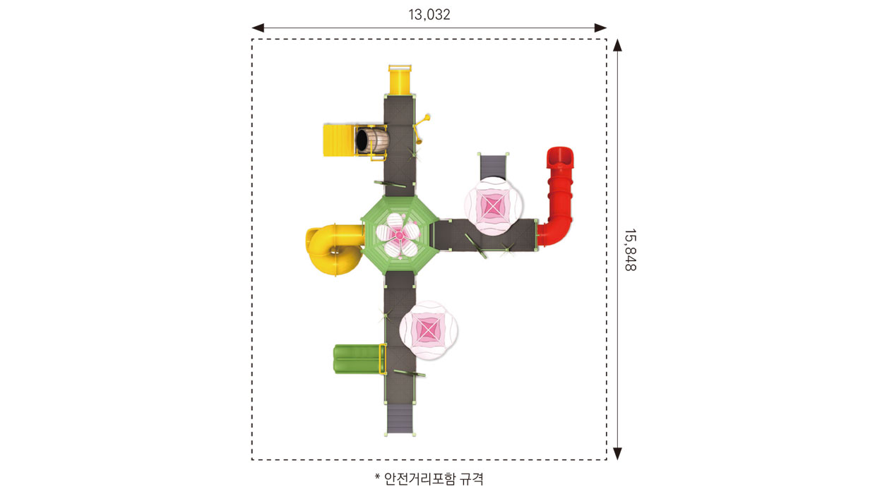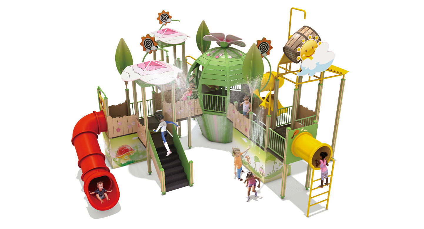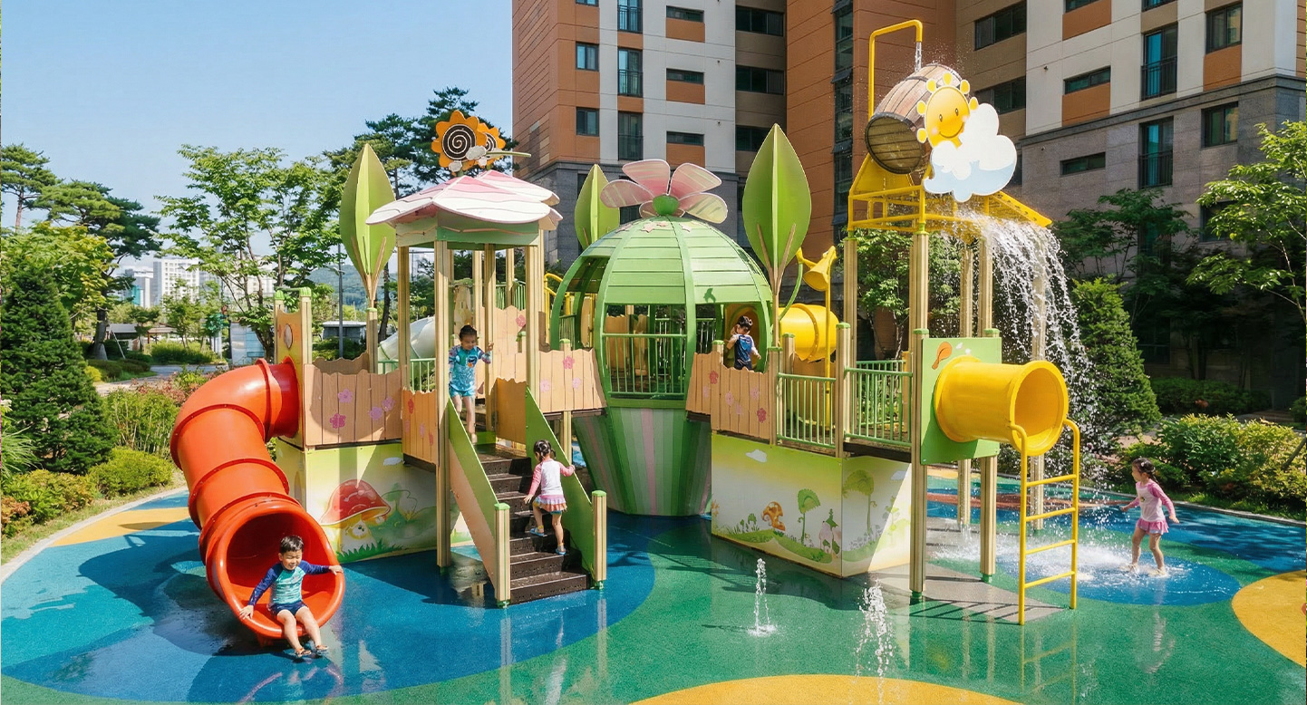꽃과 정원을 모티브로 한 구조에 워터탱크, 분사형 물놀이 장치, 터널형 미끄럼틀을 결합한 물놀이 조합놀이대로, 아이들이 오르기·이동·미끄러지기 놀이 과정에서 물을 맞고 만지며 여름철 신체 활동과 감각 자극을 동시에 즐길 수 있도록 구성하였다. 물의 낙수와 분사 효과로 놀이 몰입도를 높인 물놀이 특화 놀이시설이다.