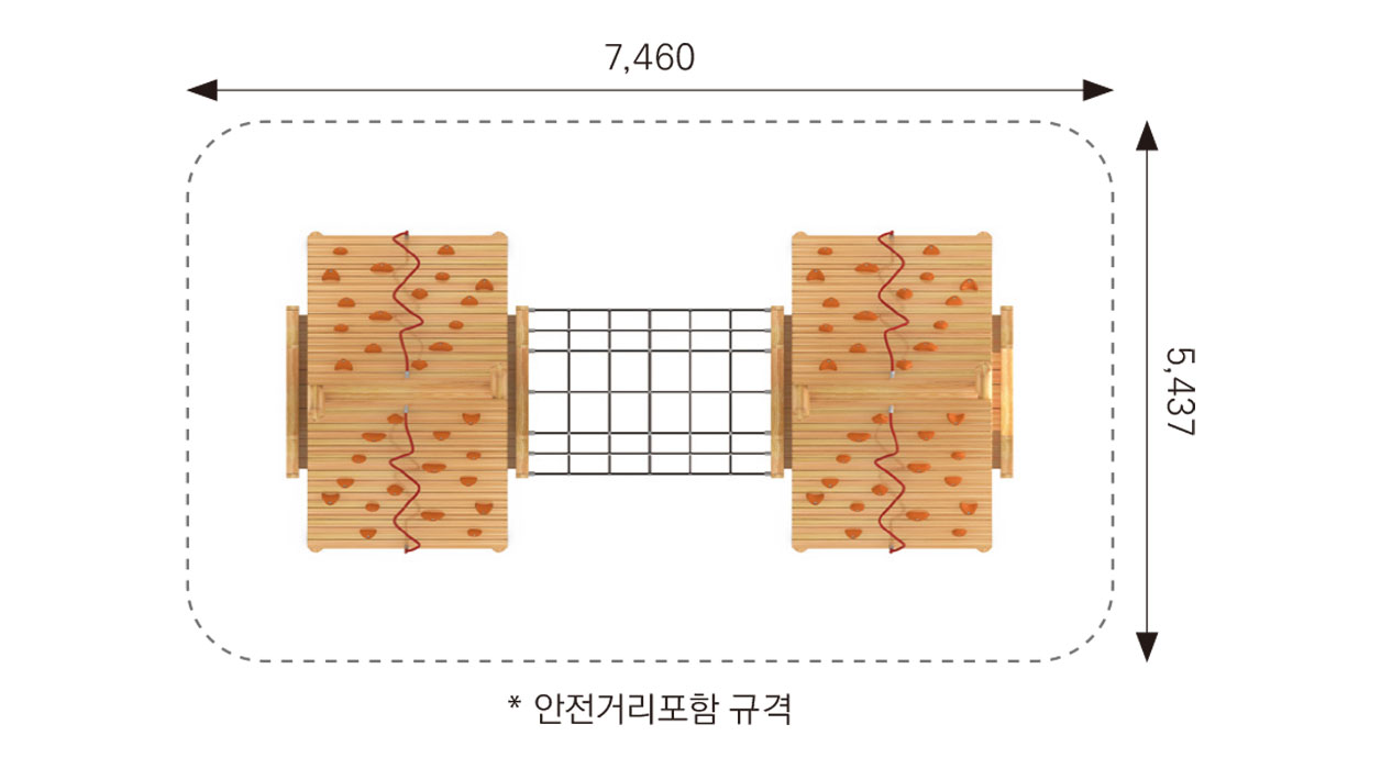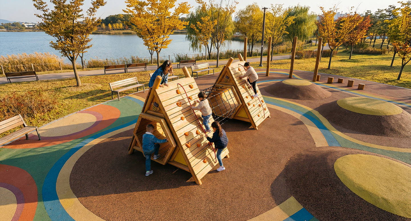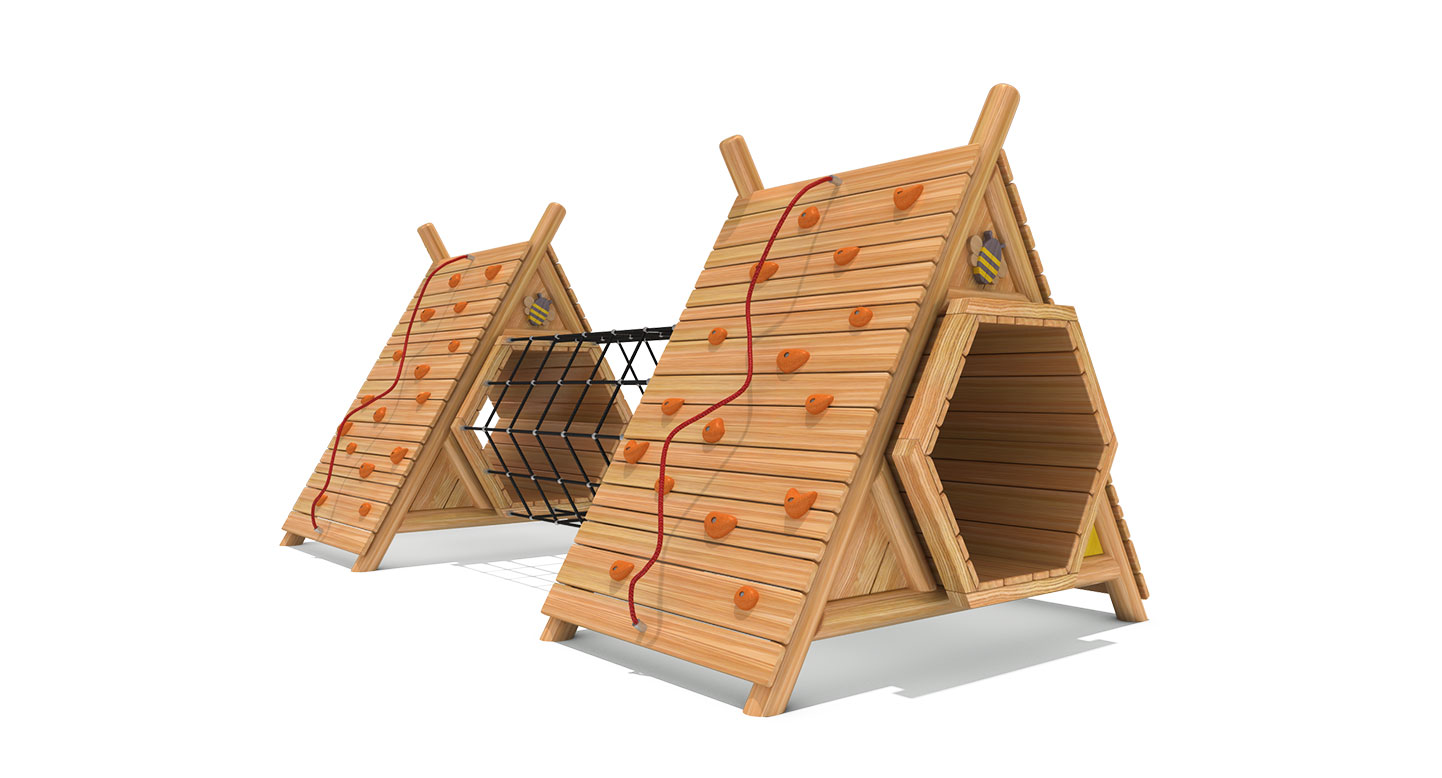 로비니아 목재로 제작된 벌집 모양의 터널과 클라이밍 벽이 연결된 구조로, 아이들이 기어가고 오르며 균형을 잡는 전신 활동을 즐길 수 있는 복합 놀이시설입니다. 자연의 벌집을 연상시키는 디자인은 아이들의 호기심과 상상력을 자극하고, 놀이 과정에서 근력·협응력·균형감각이 자연스럽게 발달됩니다.