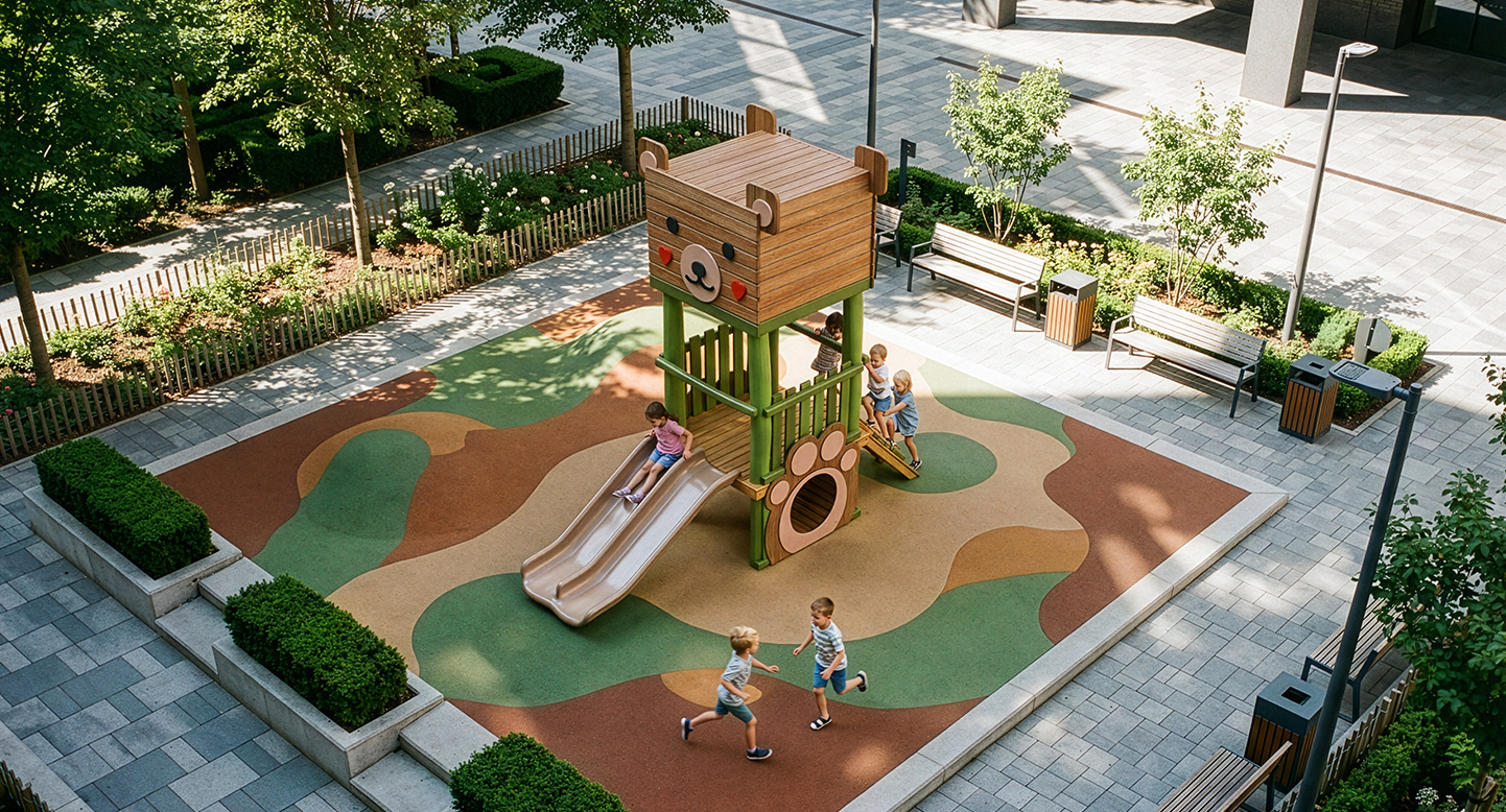 베어 큐브 로비니아 플레이(Bear Cube Robinia Play)|FNK-RO-104(곰돌이 놀이터) 제품목록으로 바로가기 자료 및 바로가기 나라장터 바로연결 도면 다운로드 시공사진 보러가기 기타 곰 캐릭터를 모티브로 한 큐브형 상부 구조에 로비니아 원목 기둥을 적용한 놀이대로, 오르기·숨기·미끄럼 요소를 한 공간에 담아 아이들의 상상 놀이와 기초 신체 활동을 동시에 유도하도록 구성한 로비니아 놀이대이다. 제품명 베어 큐브 로비니아 플레이(Bear Cube Robinia Play)|FNK-RO-104(곰돌이 놀이터) 물품식별번호 25814434|안전인증번호:CA023H10019-5049 규격 1,700 × 4,190 × 3,920(H), 3종 재질 robinia, hpl, pe, PP rope, hard wood 베어 큐브 로비니아 플레이(Bear Cube Robinia Play)|FNK-RO-104(곰돌이 놀이터) 물품식별번호 25814434|안전인증번호:CA023H10019-5049 규격 1,700 × 4,190 × 3,920(H), 3종 재질 robinia, hpl, pe, PP rope, hard wood 기타 곰 캐릭터를 모티브로 한 큐브형 상부 구조에 로비니아 원목 기둥을 적용한 놀이대로, 오르기·숨기·미끄럼 요소를 한 공간에 담아 아이들의 상상 놀이와 기초 신체 활동을 동시에 유도하도록 구성한 로비니아 놀이대이다. 자료 및 바로가기 나라장터 바로연결 도면 다운로드 시공사진 보러가기