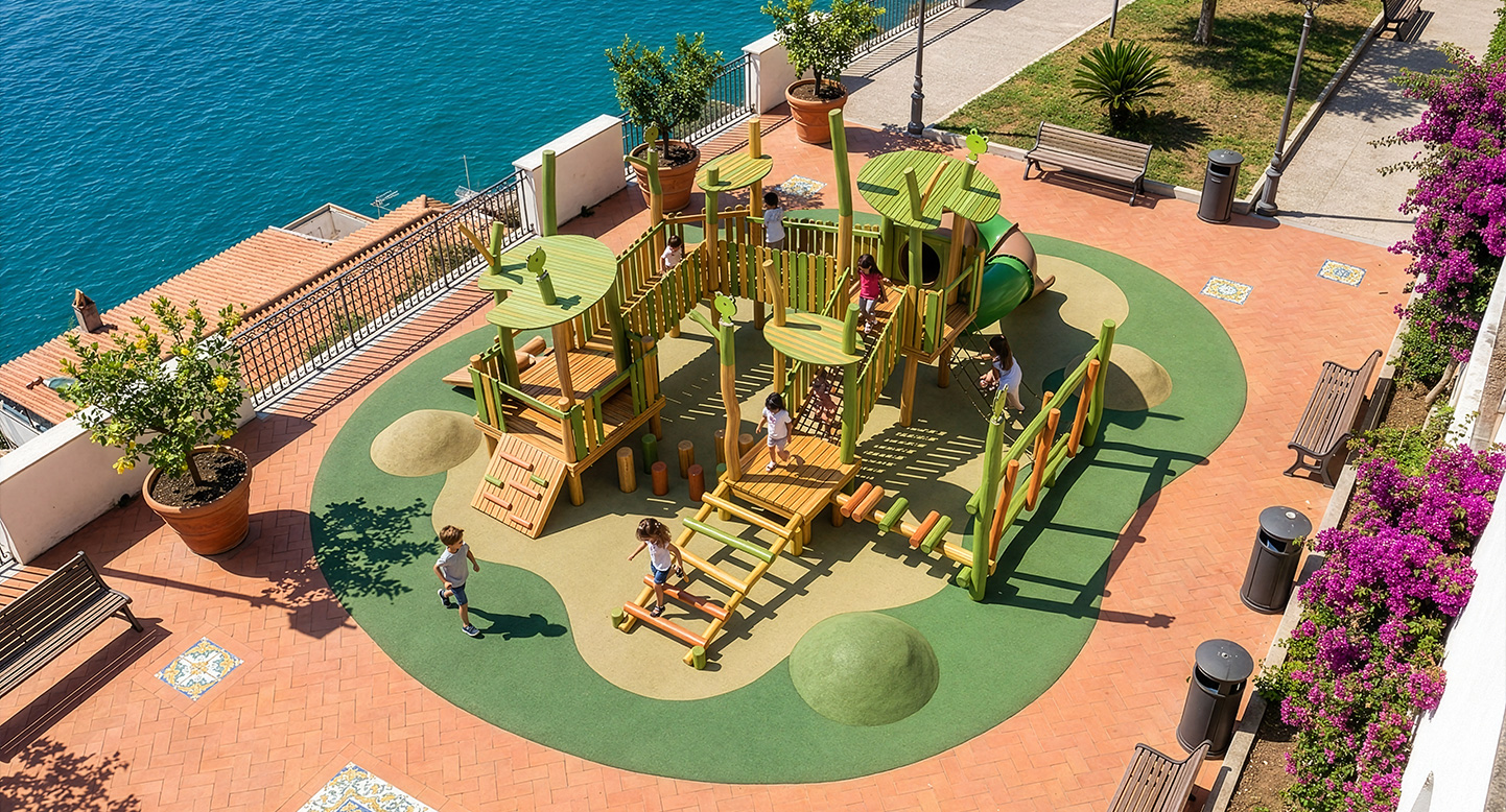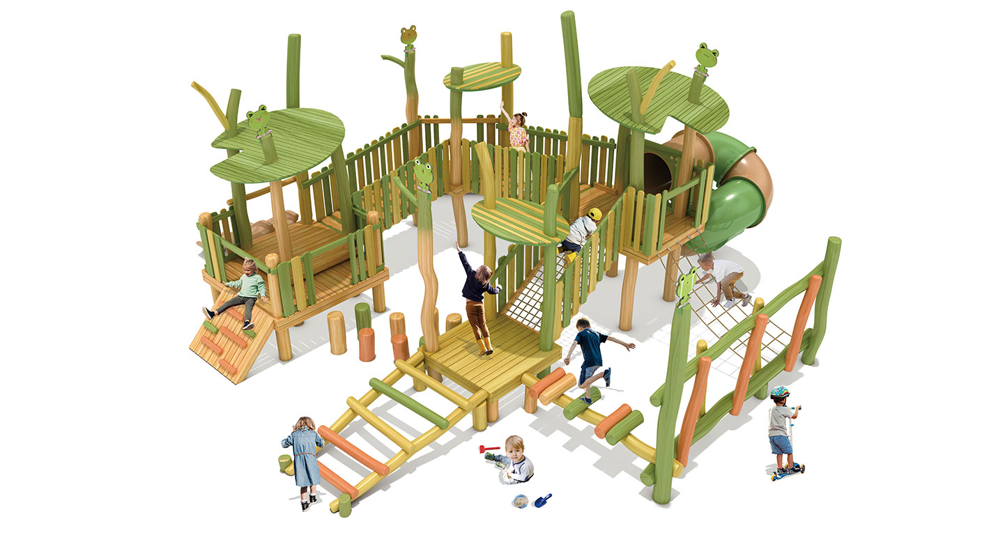 로비니아 원목을 활용해 잎사귀 쉼터와 동물 모티브를 결합한 놀이 구조로, 데크·브리지·징검·오르기 요소를 하나의 순환 동선으로 구성한 로비니아 조합놀이대이다. 아이들이 걷고 건너며 자연 속 친구들과 어울리듯 균형감과 신체 활동, 상상 놀이를 함께 경험하도록 설계되었다.