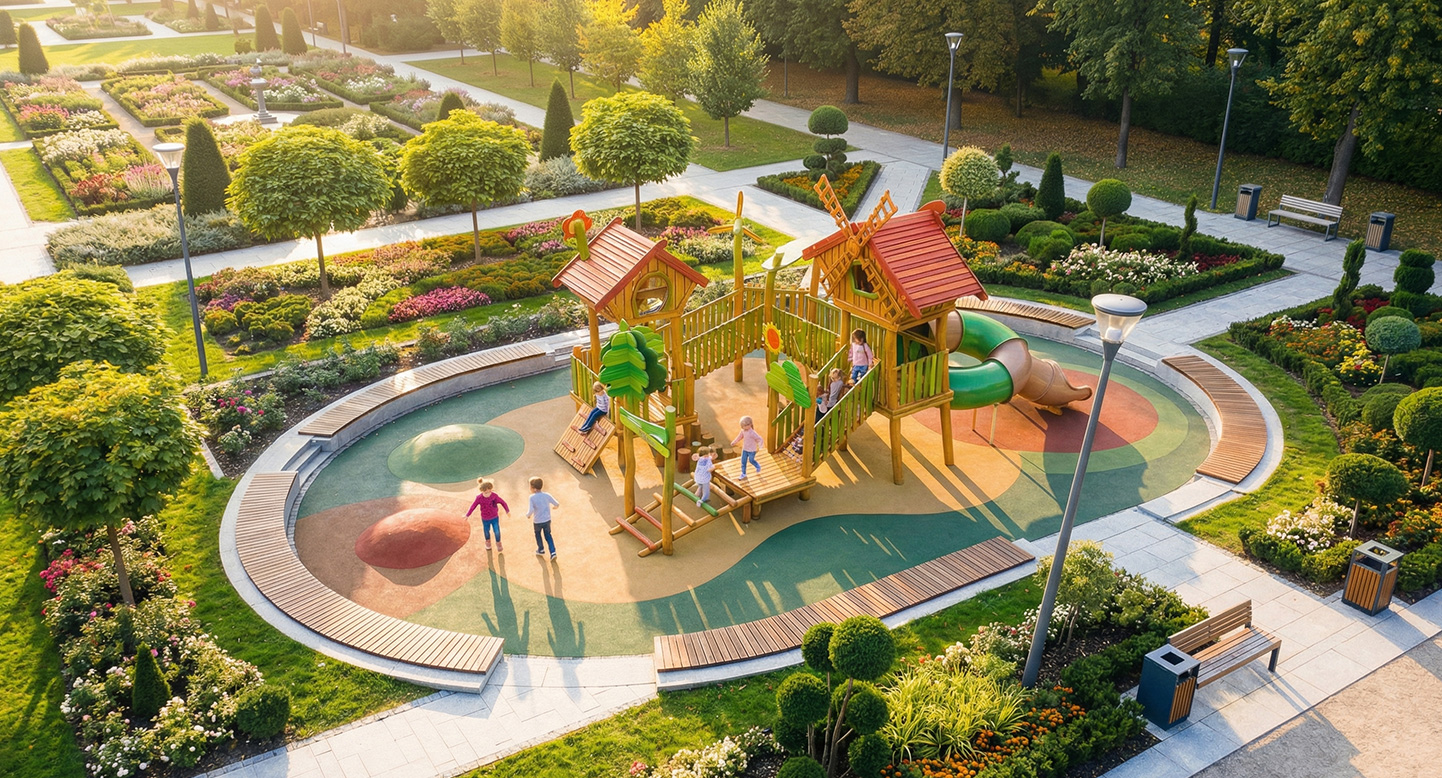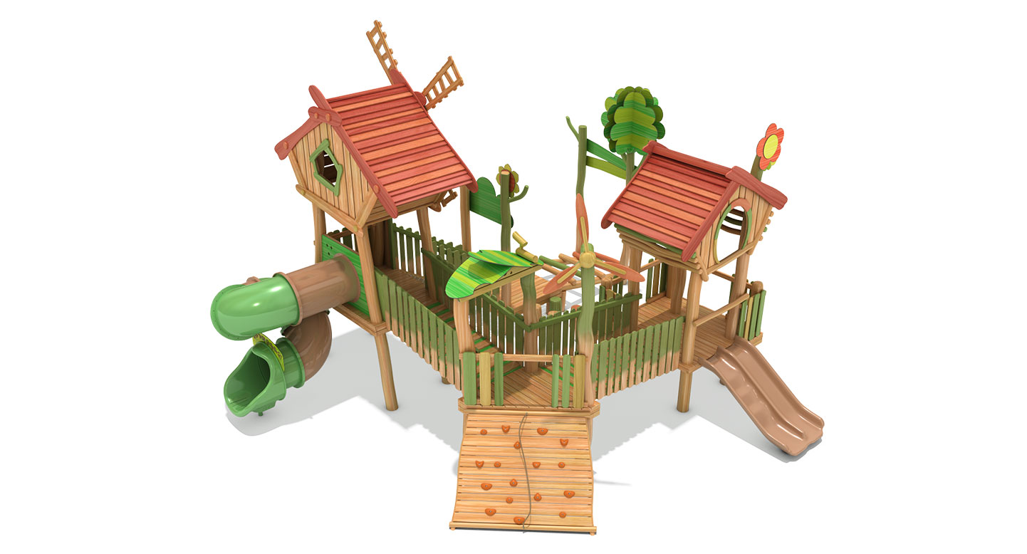 로비니아 원목의 따뜻한 질감과 숲속 오두막·풍차 모티브를 결합해 데크와 브리지를 따라 걷고 건너며 자연을 체험하도록 구성한 로비니아 조합놀이대이다. 자연 지형을 닮은 높이 변화와 오르기 요소로 균형감·탐험성을 키우는 숲속 마을형 놀이공간을 구현했다.