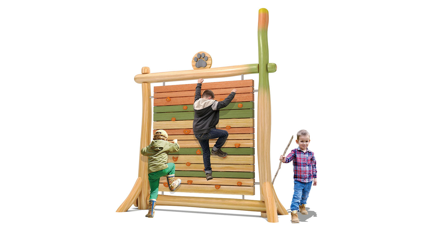 다양한 색감의 목재 패널과 귀여운 곰 발바닥 모티브가 적용된 자연형 암벽 놀이시설입니다. 아이들은 손과 발을 이용해 패널을 오르며 근력과 집중력을 기르고, 놀이를 통해 도전 정신과 성취감을 자연스럽게 경험할 수 있습니다. 로비니아 원목의 따뜻한 촉감과 자연친화적 디자인이 숲속 테마 공간과 조화를 이룹니다.