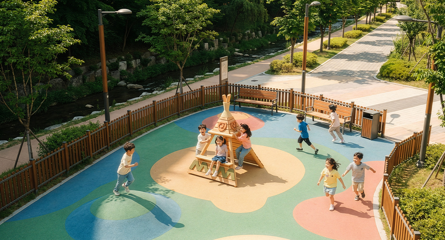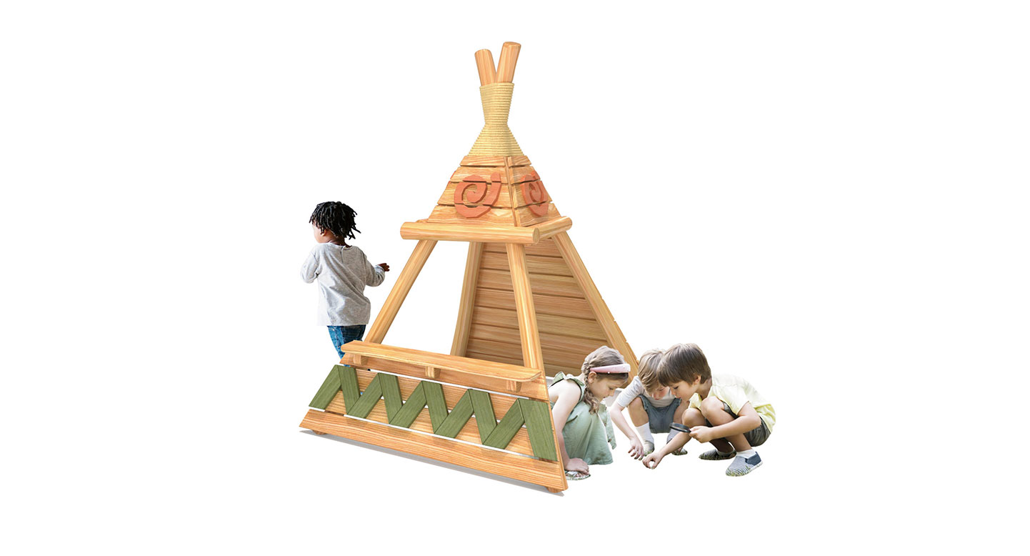 인디언 텐트를 모티브로 만든 자연목 놀이집으로, 아이들이 안으로 들어가 숨거나 모여 이야기하며 상상력을 자유롭게 펼칠 수 있는 테마형 놀이공간입니다. 로비니아 목재의 따뜻한 질감과 전통 패턴 디자인이 조화를 이루어, 정서 안정과 창의 놀이에 적합한 휴식형 놀이시설입니다.