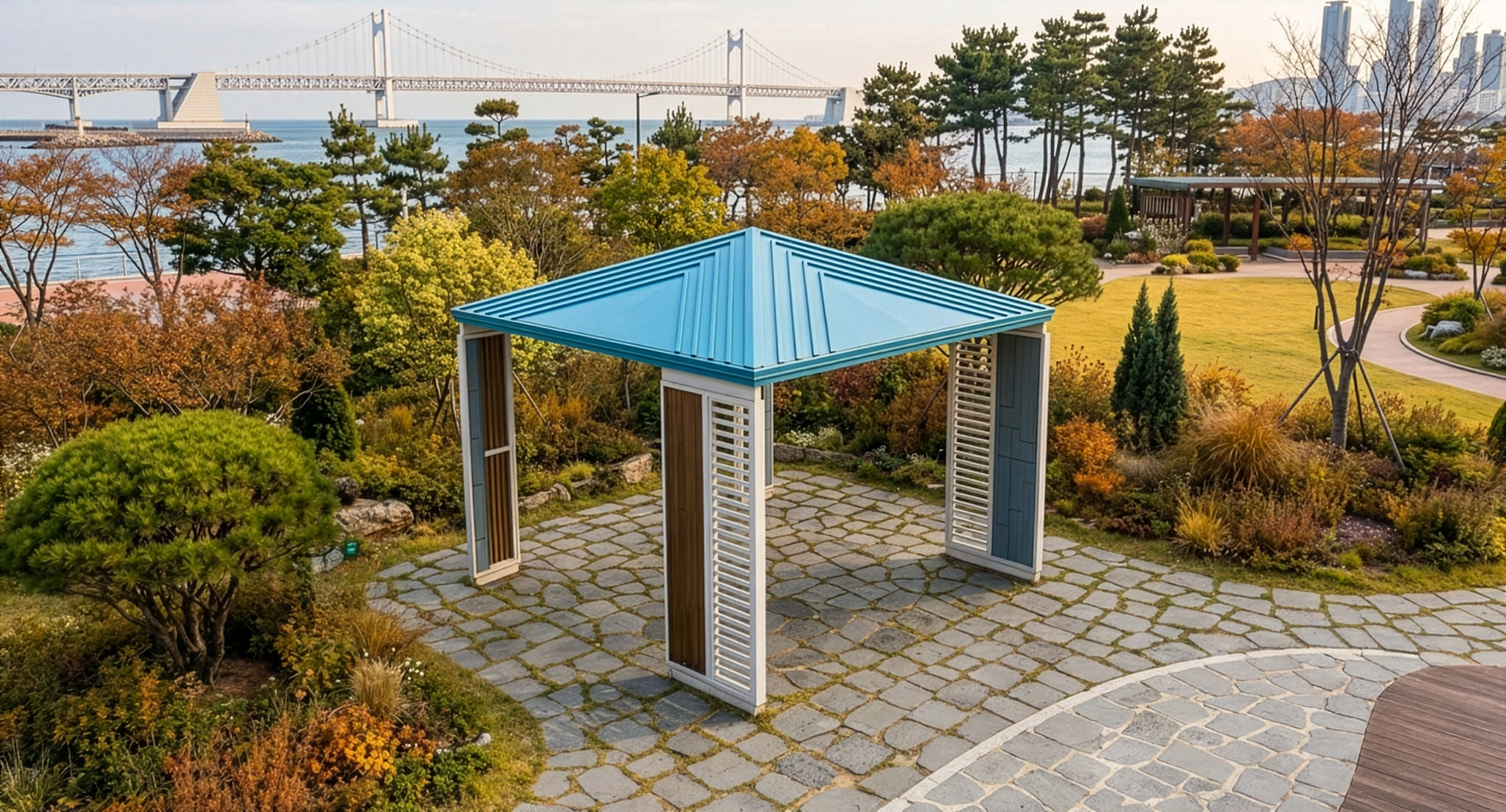 스카이 루버 쉼터 (Sky Louver Shelter)|GC-P-2144 제품목록으로 바로가기 자료 및 바로가기 나라장터 바로연결 도면 다운로드 시공사진 보러가기 기타 밝은 스카이블루 지붕과 루버 디테일로 경쾌하고 젊은 분위기를 담은 쉼터입니다. 부담 없는 컬러 조합과 개방형 구조가 일상 공간 어디서나 산뜻한 포인트가 됩니다. 제품명 스카이 루버 쉼터 (Sky Louver Shelter)|GC-P-2144 물품식별번호 25651666 규격 3,800 × 3,800 × 3,350(H) 재질 stl, galvanized, polycarbonate, hard wood, hpl 스카이 루버 쉼터 (Sky Louver Shelter)|GC-P-2144 물품식별번호 25651666 규격 3,800 × 3,800 × 3,350(H) 재질 stl, galvanized, polycarbonate, hard wood, hpl 기타 밝은 스카이블루 지붕과 루버 디테일로 경쾌하고 젊은 분위기를 담은 쉼터입니다. 부담 없는 컬러 조합과 개방형 구조가 일상 공간 어디서나 산뜻한 포인트가 됩니다. 자료 및 바로가기 나라장터 바로연결 도면 다운로드 시공사진 보러가기