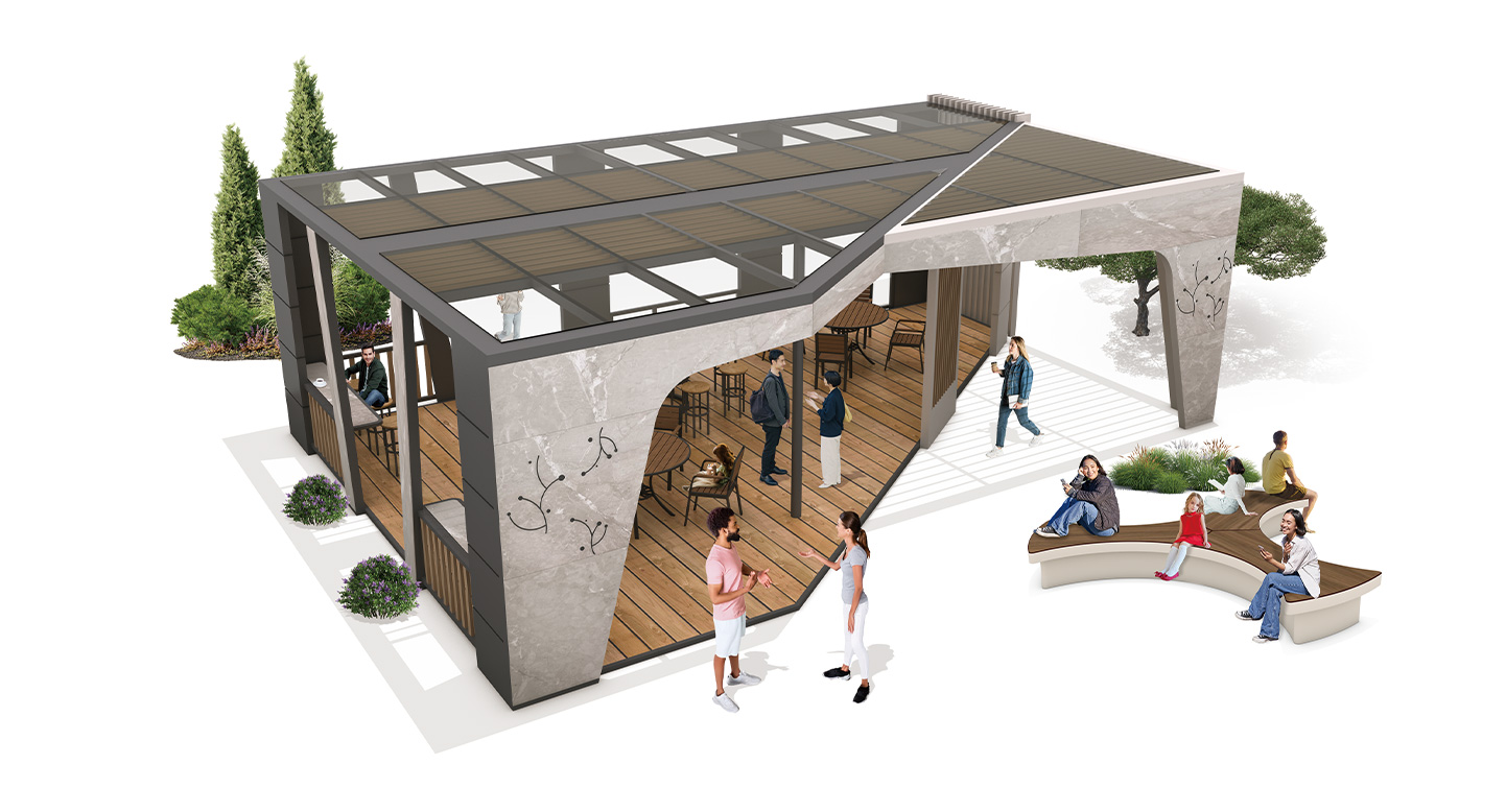루미엣지 (Lumi Edge)|GC-TH-005 제품목록으로 바로가기 자료 및 바로가기 나라장터 바로연결 도면 다운로드 시공사진 보러가기 기타 사선형 개방 입면과 대리석 패턴 외벽이 조화를 이루는 고급형 쉼터. 블랙과 우드톤의 절제된 조합으로 구조미와 개방감을 동시에 살렸습니다. 제품명 루미엣지 (Lumi Edge)|GC-TH-005 물품식별번호 25544829 규격 10,100 × 7,000 × 3,300(H) 재질 stl, glavannized, polycarbonate, hard wood, hpl, 강화유리 루미엣지 (Lumi Edge)|GC-TH-005 물품식별번호 25544829 규격 10,100 × 7,000 × 3,300(H) 재질 stl, glavannized, polycarbonate, hard wood, hpl, 강화유리 기타 사선형 개방 입면과 대리석 패턴 외벽이 조화를 이루는 고급형 쉼터. 블랙과 우드톤의 절제된 조합으로 구조미와 개방감을 동시에 살렸습니다. 자료 및 바로가기 나라장터 바로연결 도면 다운로드 시공사진 보러가기