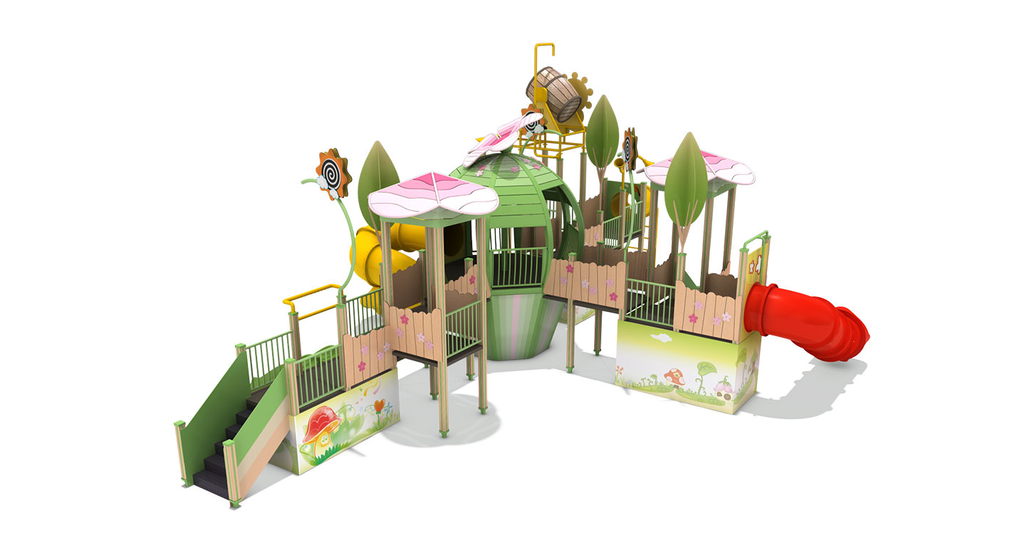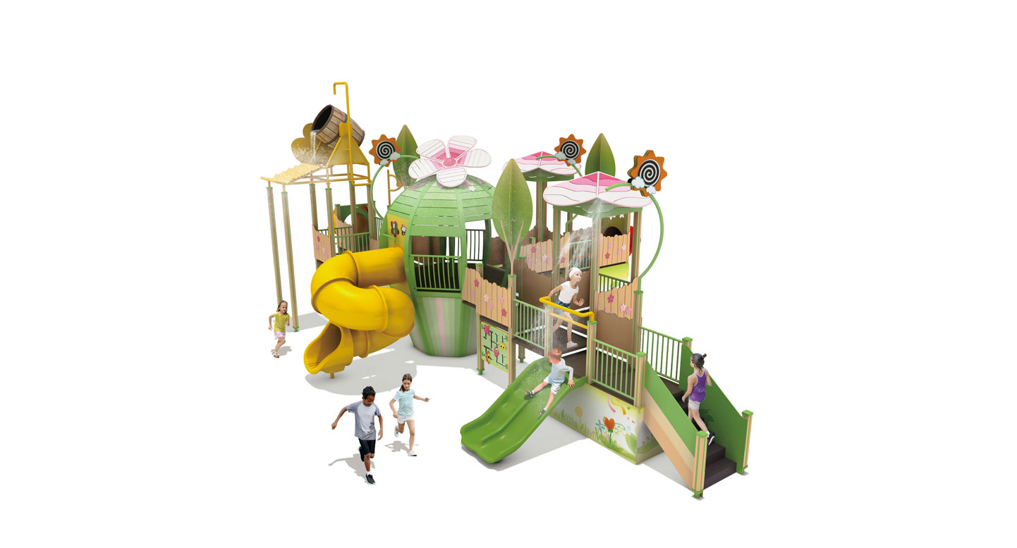 꽃과 정원을 모티브로 한 구조에 워터탱크, 분사형 물놀이 장치, 터널형 미끄럼틀을 결합한 물놀이 조합놀이대로, 아이들이 오르기·이동·미끄러지기 놀이 과정에서 물을 맞고 만지며 여름철 신체 활동과 감각 자극을 동시에 즐길 수 있도록 구성하였다. 물의 낙수와 분사 효과로 놀이 몰입도를 높인 물놀이 특화 놀이시설이다.