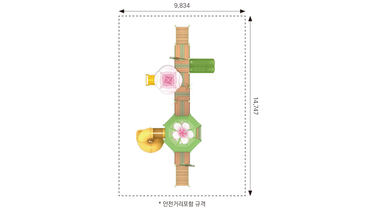 그린 블라썸 플레이하우스 (Green Blossom Playhouse)|GGPG-002A-2 제품목록으로 바로가기 자료 및 바로가기 나라장터 바로연결 도면 다운로드 시공사진 보러가기 기타 꽃봉오리가 활짝 피어나는 정원을 모티브로 한 돔형 중심 공간에 데크·계단·슬라이드를 부드럽게 연결해, 아이들이 머물고 오가며 상상력·교류·탐험 놀이가 자연스럽게 확장되는 가든형 조합놀이시설입니다. 제품명 그린 블라썸 플레이하우스 (Green Blossom Playhouse)|GGPG-002A-2 물품식별번호 25988093|안전인증번호:CA023H10019-3021 규격 11,747 × 5,834 × 4,559(H), 6종 재질 stl, hpl, pe, hard wood 그린 블라썸 플레이하우스 (Green Blossom Playhouse)|GGPG-002A-2 물품식별번호 25988093|안전인증번호:CA023H10019-3021 규격 11,747 × 5,834 × 4,559(H), 6종 재질 stl, hpl, pe, hard wood 기타 꽃봉오리가 활짝 피어나는 정원을 모티브로 한 돔형 중심 공간에 데크·계단·슬라이드를 부드럽게 연결해, 아이들이 머물고 오가며 상상력·교류·탐험 놀이가 자연스럽게 확장되는 가든형 조합놀이시설입니다. 자료 및 바로가기 나라장터 바로연결 도면 다운로드 시공사진 보러가기