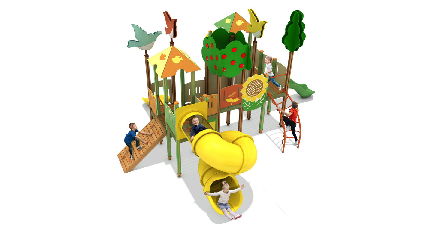 애플 가든 버드빌리지 (Apple Garden Bird Village)|GGPG-004-5 제품목록으로 바로가기 자료 및 바로가기 나라장터 바로연결 도면 다운로드 시공사진 보러가기 기타 사과나무와 새가 공존하는 정원형 숲을 모티브로, 다층 데크와 브릿지·슬라이드를 마을처럼 연결해 아이들이 정원을 거닐듯 이동하며 탐험·교류·상상 놀이를 자연스럽게 즐기는 가든형 조합놀이시설입니다. 제품명 애플 가든 버드빌리지 (Apple Garden Bird Village)|GGPG-004-5 물품식별번호 25100772|안전인증번호:CA023H10019-3024 규격 8,019 × 8,241 × 4,300(H), 10종 재질 stl, hpl, pe, hard wood 애플 가든 버드빌리지 (Apple Garden Bird Village)|GGPG-004-5 물품식별번호 25100772|안전인증번호:CA023H10019-3024 규격 8,019 × 8,241 × 4,300(H), 10종 재질 stl, hpl, pe, hard wood 기타 사과나무와 새가 공존하는 정원형 숲을 모티브로, 다층 데크와 브릿지·슬라이드를 마을처럼 연결해 아이들이 정원을 거닐듯 이동하며 탐험·교류·상상 놀이를 자연스럽게 즐기는 가든형 조합놀이시설입니다. 자료 및 바로가기 나라장터 바로연결 도면 다운로드 시공사진 보러가기