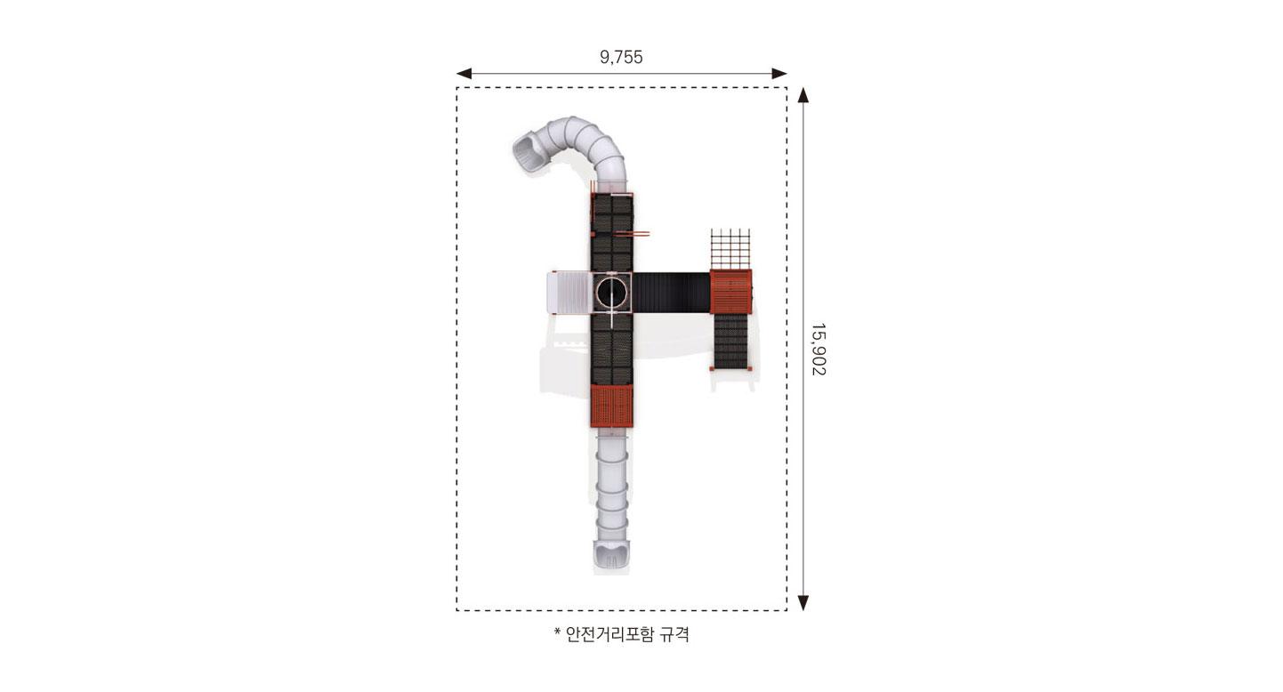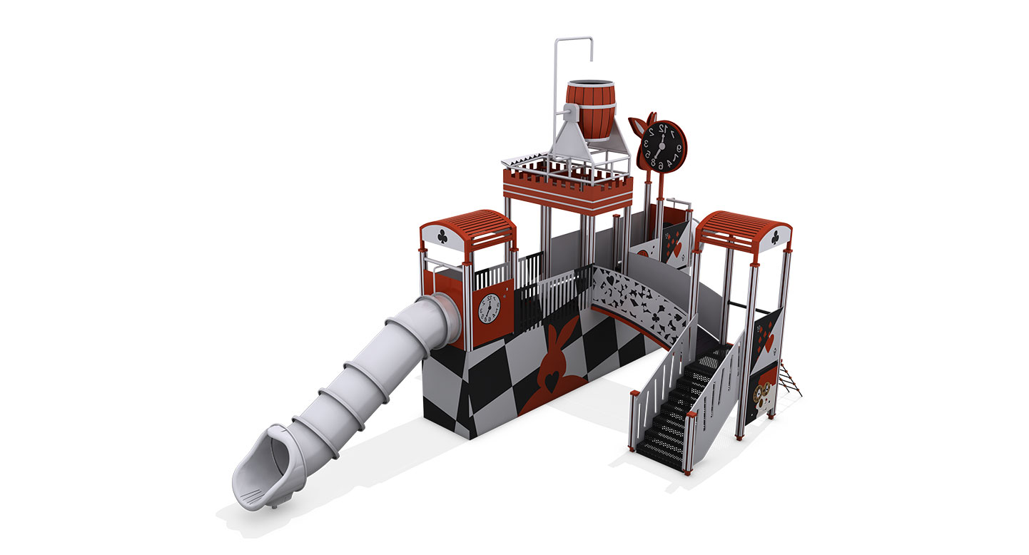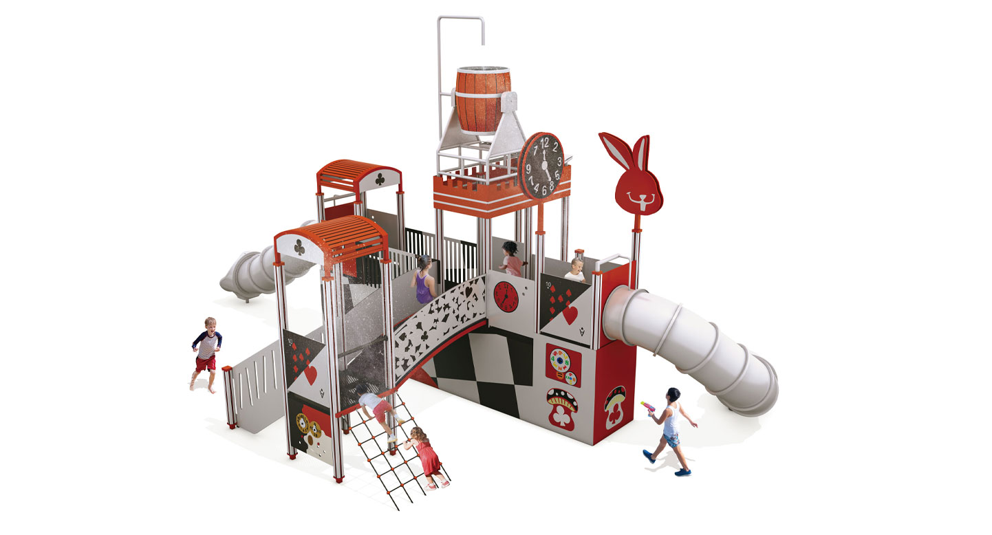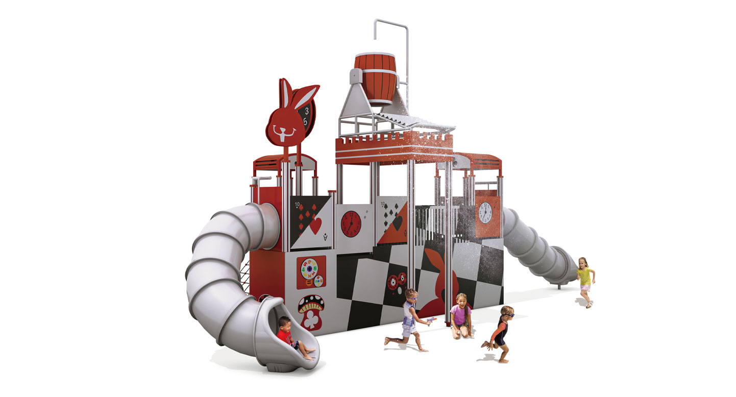 카드 패턴과 시계 타워를 모티브로 한 구조에 워터버킷 낙수와 분사형 물놀이 요소, 터널형 미끄럼틀을 결합한 물놀이 조합놀이대이다. 오르기·이동·미끄러지기 동선에 물의 흐름이 연계되어 아이들이 물을 맞고 피하며 놀이하도록 설계해, 여름철 신체 활동과 감각 자극, 놀이 몰입도를 동시에 높이는 물놀이 특화 시설이다.