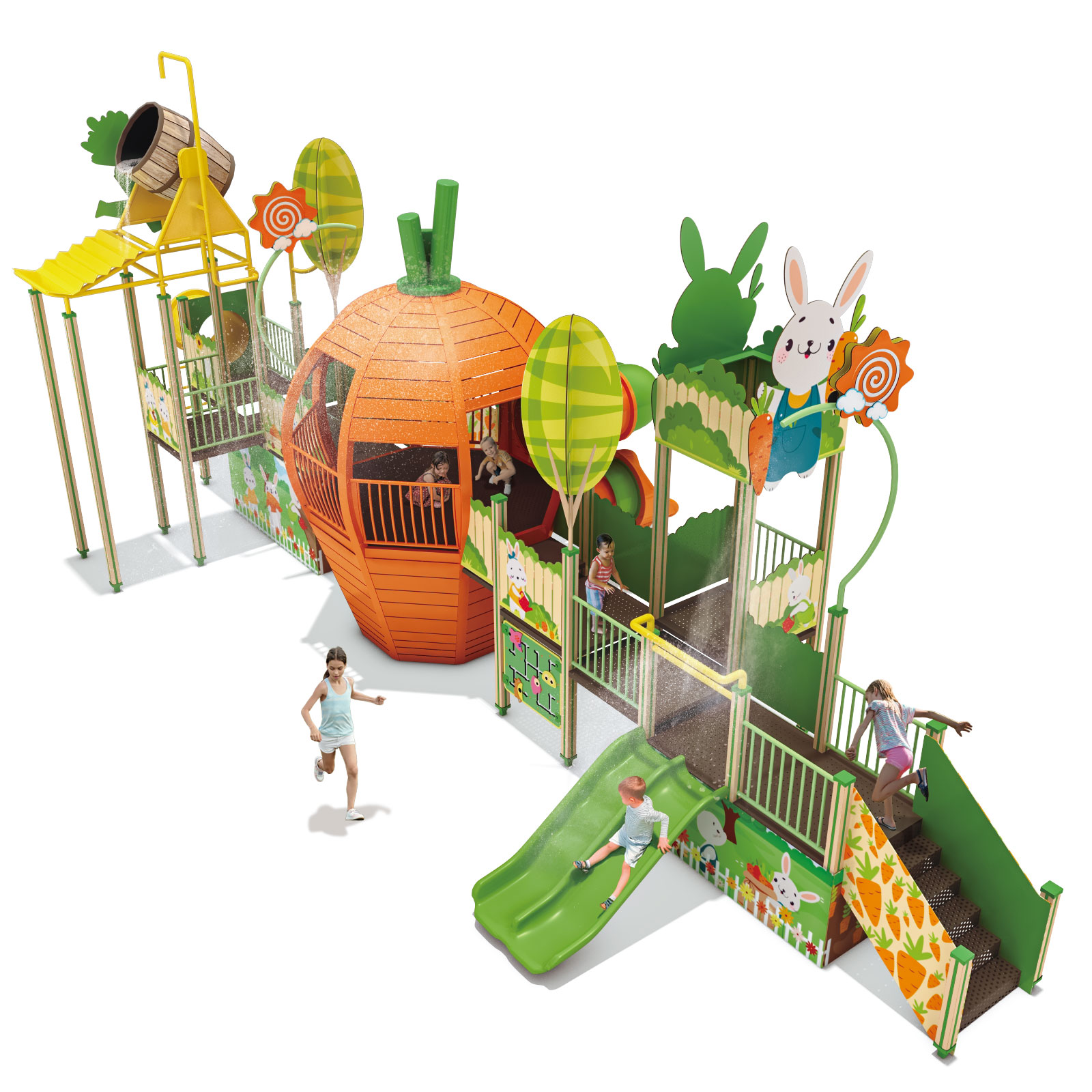당근과 토끼 농장을 모티브로 한 중앙 돔형 놀이 구조에 워터버킷 낙수, 분사형 물놀이 장치, 터널 슬라이드를 결합한 물놀이 조합놀이대입니다. 오르기·이동·미끄러지기 놀이 속에서 물을 맞고 흘려보내는 과정을 자연스럽게 경험하며, 여름철 더위 완화와 함께 신체 활동과 감각 자극을 동시에 높이도록 설계되었습니다.