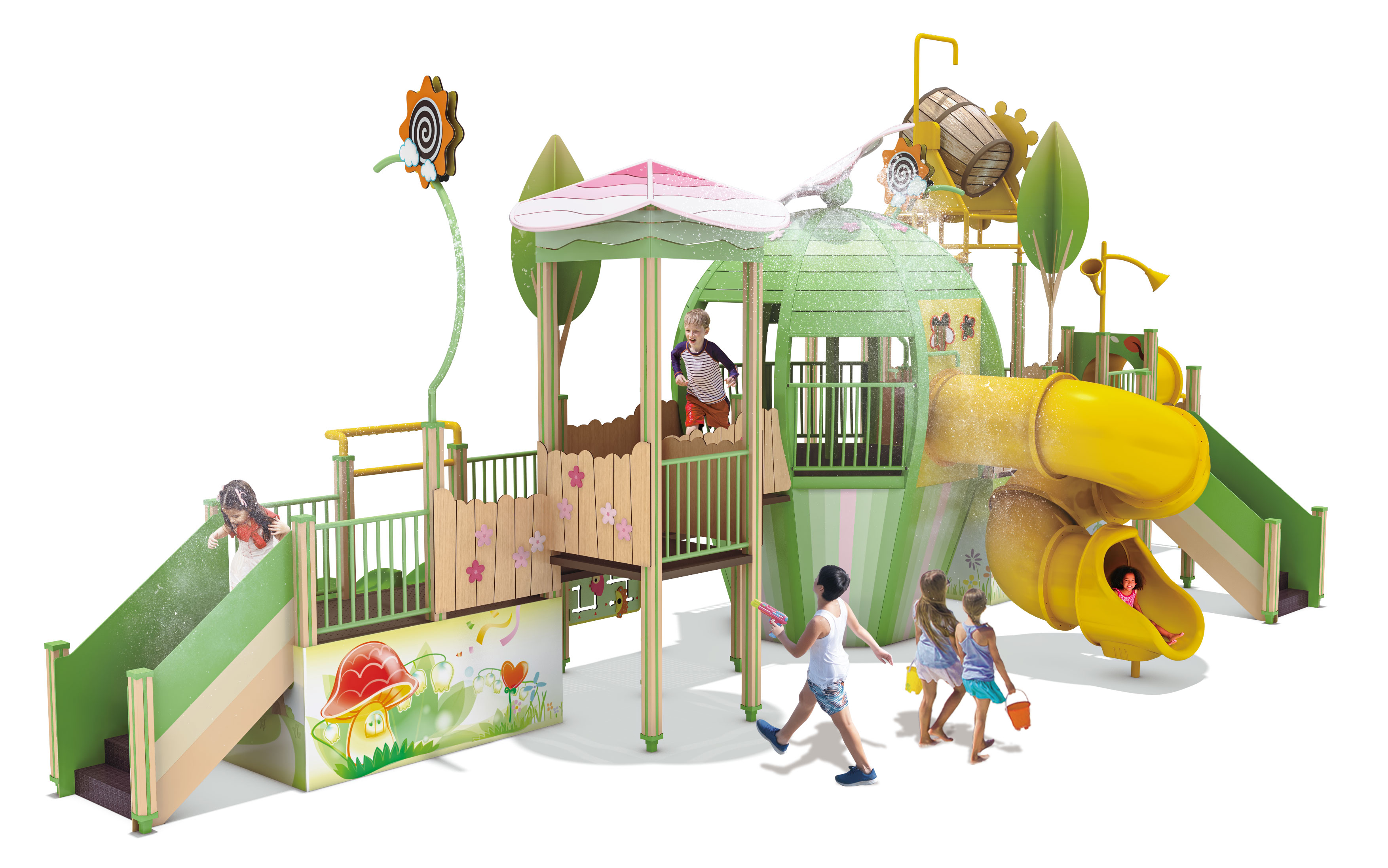 선샤인 블로썸 워터플레이(Sunshine Blossom Waterplay)|WP-J004-2A 제품목록으로 바로가기 자료 및 바로가기 나라장터 바로연결 도면 다운로드 시공사진 보러가기 기타 해바라기와 꽃을 모티브로 한 구조에 워터버킷 낙수, 분사 노즐, 터널형 미끄럼틀을 결합한 물놀이 조합놀이대로, 물의 떨어짐과 흐름을 중심으로 아이들이 오르기·이동·미끄러지기 놀이를 즐기며 여름철 신체 활동과 감각 자극을 동시에 경험할 수 있도록 구성하였다. 제품명 선샤인 블로썸 워터플레이(Sunshine Blossom Waterplay)|WP-J004-2A 물품식별번호 25988193|안전인증번호:CA023H10019-3007 규격 12,848 × 6,225 × 5,800(H), 7종 재질 sts, pe, hard wood 선샤인 블로썸 워터플레이(Sunshine Blossom Waterplay)|WP-J004-2A 물품식별번호 25988193|안전인증번호:CA023H10019-3007 규격 12,848 × 6,225 × 5,800(H), 7종 재질 sts, pe, hard wood 기타 해바라기와 꽃을 모티브로 한 구조에 워터버킷 낙수, 분사 노즐, 터널형 미끄럼틀을 결합한 물놀이 조합놀이대로, 물의 떨어짐과 흐름을 중심으로 아이들이 오르기·이동·미끄러지기 놀이를 즐기며 여름철 신체 활동과 감각 자극을 동시에 경험할 수 있도록 구성하였다. 자료 및 바로가기 나라장터 바로연결 도면 다운로드 시공사진 보러가기