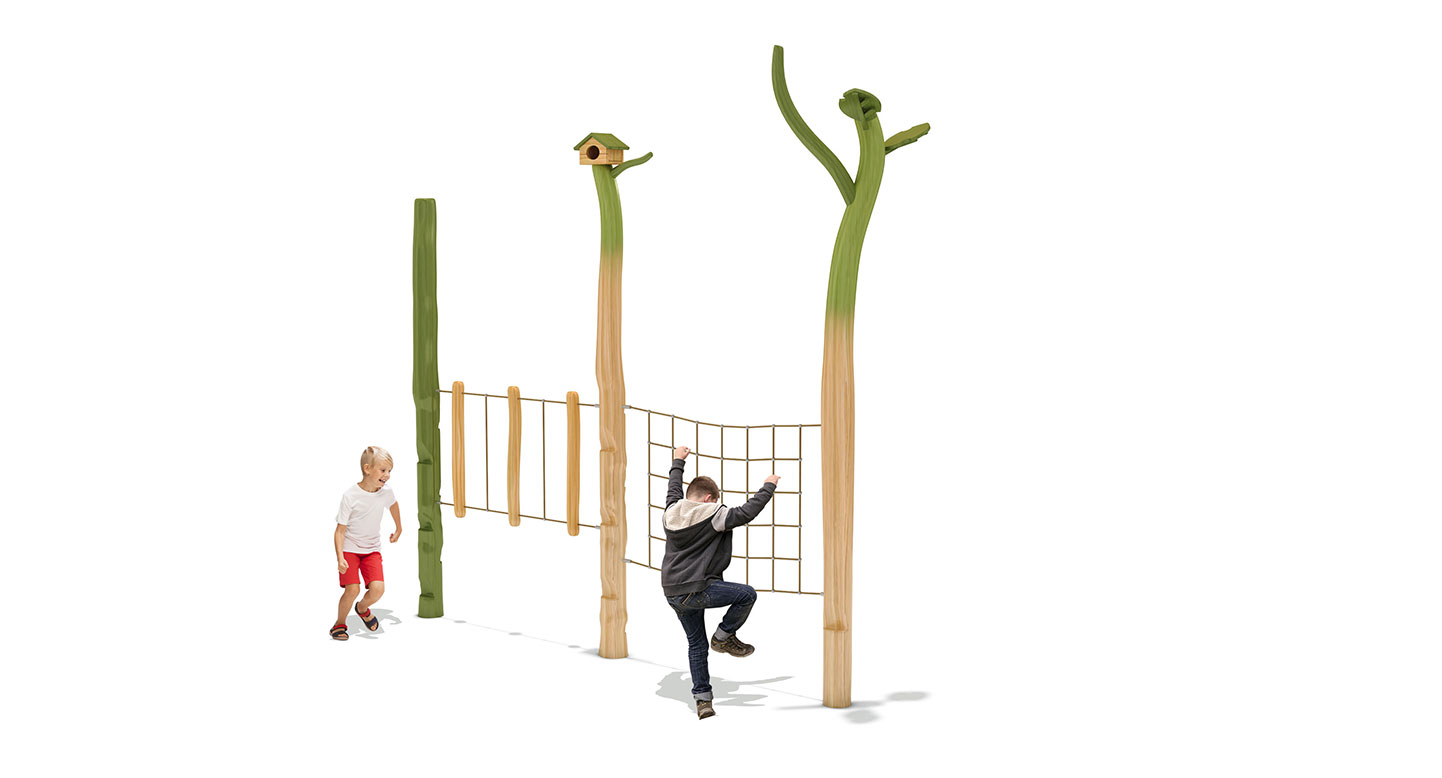 자연 수목을 형상화한 로비니아 목재 기둥과 로프 네트, 밸런스 브리지를 활용한 장애물 코스로, 아이들이 오르기‧건너기‧매달리기 등의 전신 활동을 통해 균형감각과 근력을 자연스럽게 발달시킬 수 있는 숲 테마 놀이시설입니다. 간결한 동선 구성으로 작은 공간에서도 높은 놀이 효과를 제공합니다.