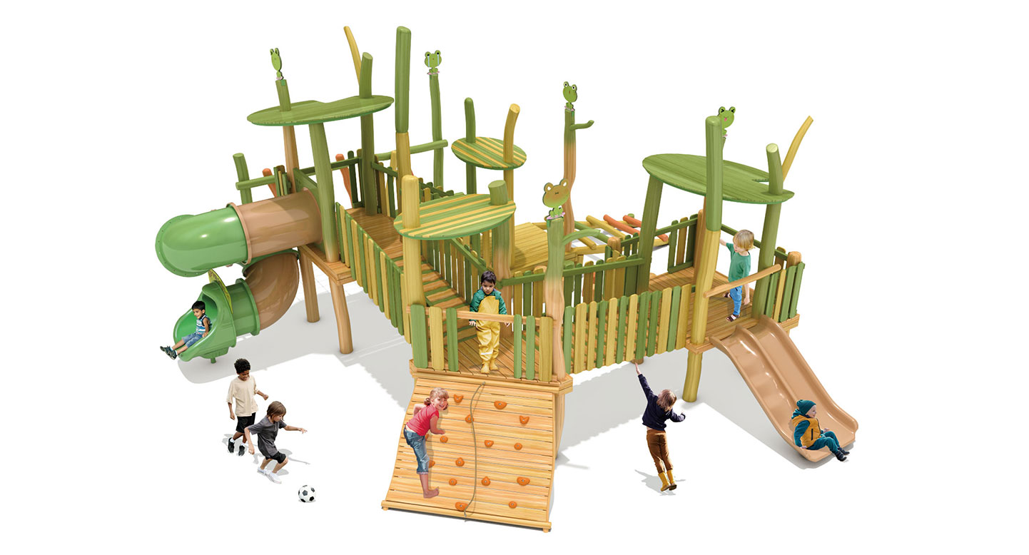 로비니아 원목을 활용해 잎사귀 쉼터와 동물 모티브를 결합한 놀이 구조로, 데크·브리지·징검·오르기 요소를 하나의 순환 동선으로 구성한 로비니아 조합놀이대이다. 아이들이 걷고 건너며 자연 속 친구들과 어울리듯 균형감과 신체 활동, 상상 놀이를 함께 경험하도록 설계되었다.