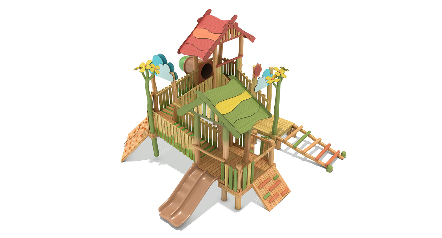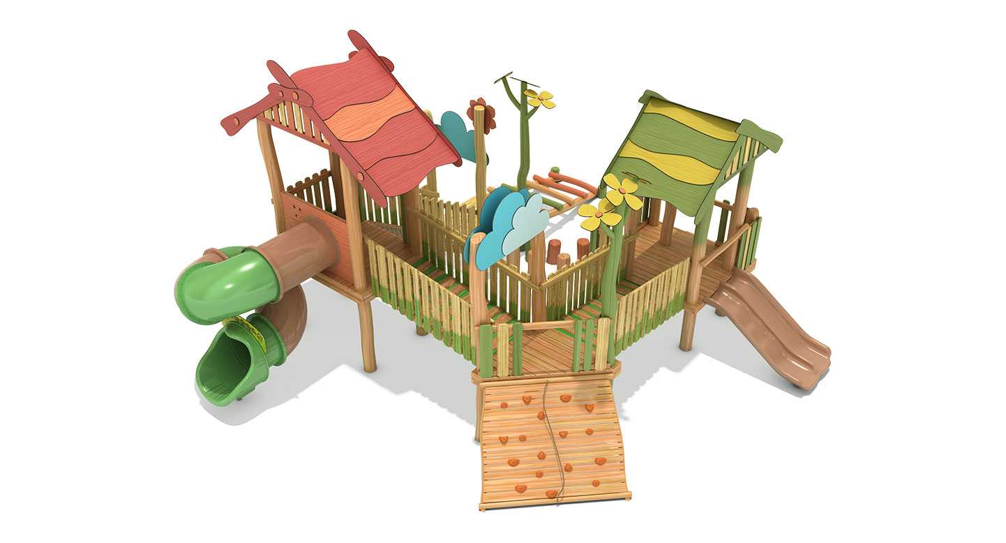 로비니아 원목을 사용해 꽃과 구름 모티브의 오두막과 데크를 연결한 로비니아 조합놀이대로, 걷기·건너기·오르기 동선을 따라 이동하며 아이들이 자연 속 작은 마을을 탐험하듯 놀이하도록 구성하였다. 균형감과 신체 활동, 상상 놀이가 조화롭게 이루어지는 자연친화형 놀이공간이다.