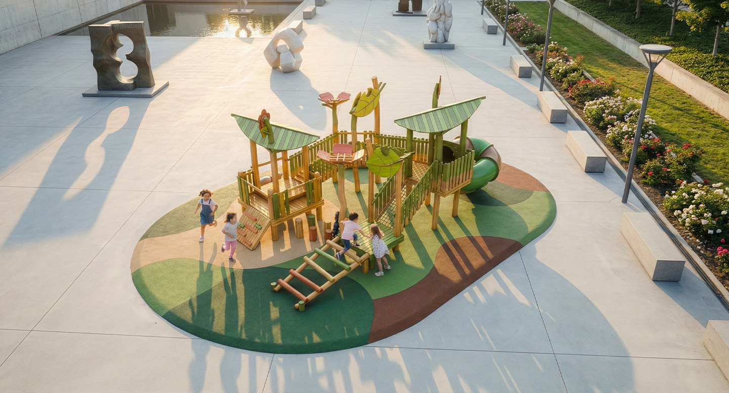 리프 가든 로비니아 플레이(Reef Garden Robinia Play)|FNK-RO-106-1 제품목록으로 바로가기 자료 및 바로가기 나라장터 바로연결 도면 다운로드 시공사진 보러가기 기타 로비니아 원목의 질감을 살린 잎사귀 모티브 구조에 데크·브리지·징검 요소를 연결해 아이들이 걷고 건너며 균형감과 탐험 놀이를 자연스럽게 경험하도록 구성한 로비니아 조합놀이대이다. 제품명 리프 가든 로비니아 플레이(Reef Garden Robinia Play)|FNK-RO-106-1 물품식별번호 24724862|안전인증번호:CA023H10019-2001 규격 8,495 × 7,675 × 4,530(H), 8종 재질 robinia, hpl, pe, PP rope, hard wood 리프 가든 로비니아 플레이(Reef Garden Robinia Play)|FNK-RO-106-1 물품식별번호 24724862|안전인증번호:CA023H10019-2001 규격 8,495 × 7,675 × 4,530(H), 8종 재질 robinia, hpl, pe, PP rope, hard wood 기타 로비니아 원목의 질감을 살린 잎사귀 모티브 구조에 데크·브리지·징검 요소를 연결해 아이들이 걷고 건너며 균형감과 탐험 놀이를 자연스럽게 경험하도록 구성한 로비니아 조합놀이대이다. 자료 및 바로가기 나라장터 바로연결 도면 다운로드 시공사진 보러가기