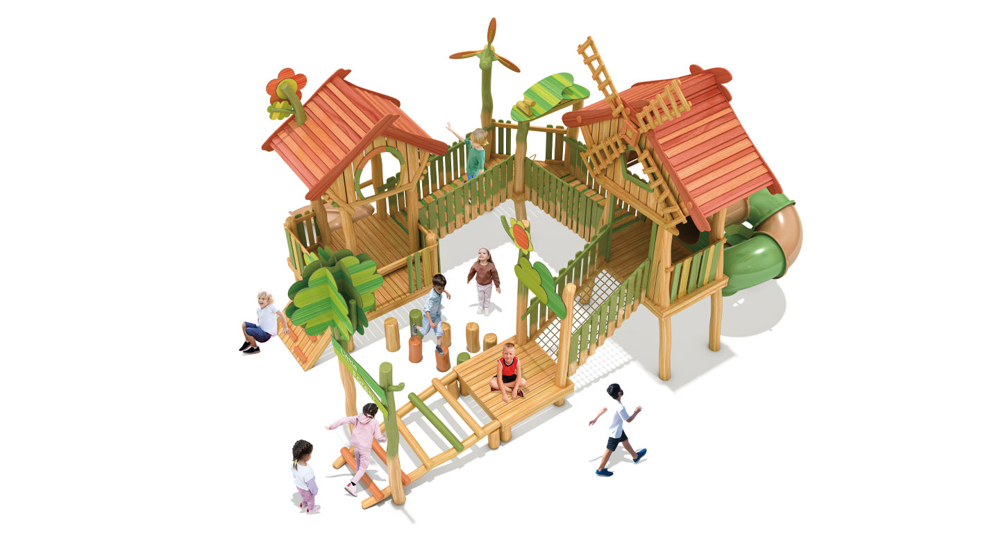 로비니아 원목의 따뜻한 질감과 숲속 오두막·풍차 모티브를 결합해 데크와 브리지를 따라 걷고 건너며 자연을 체험하도록 구성한 로비니아 조합놀이대이다. 자연 지형을 닮은 높이 변화와 오르기 요소로 균형감·탐험성을 키우는 숲속 마을형 놀이공간을 구현했다.