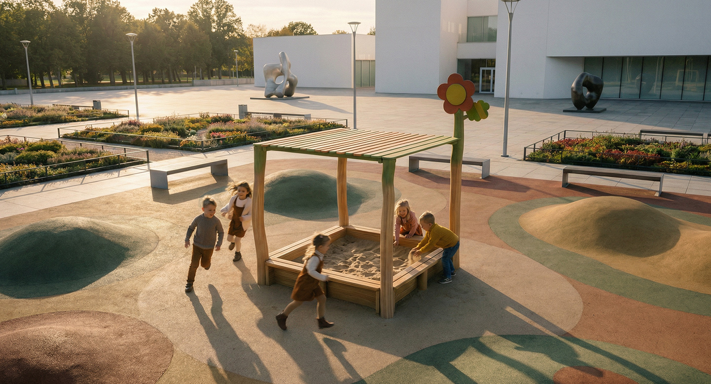 자연친화적인 원목 구조로 제작된 모래놀이 공간으로, 지붕이 있어 햇빛을 차단하며 쾌적하게 놀이할 수 있습니다. 아이들이 모래를 활용한 만들기·탐색 놀이를 통해 감각 발달과 창의력을 키울 수 있는 자연형 놀이시설입니다. 귀여운 꽃 장식 요소가 추가되어 정서적 안정감과 즐거움을 함께 제공합니다.