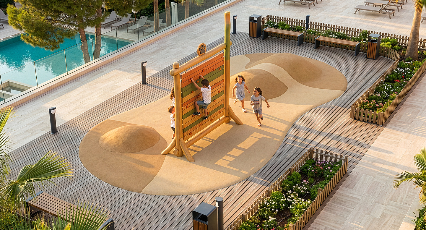 다양한 색감의 목재 패널과 귀여운 곰 발바닥 모티브가 적용된 자연형 암벽 놀이시설입니다. 아이들은 손과 발을 이용해 패널을 오르며 근력과 집중력을 기르고, 놀이를 통해 도전 정신과 성취감을 자연스럽게 경험할 수 있습니다. 로비니아 원목의 따뜻한 촉감과 자연친화적 디자인이 숲속 테마 공간과 조화를 이룹니다.