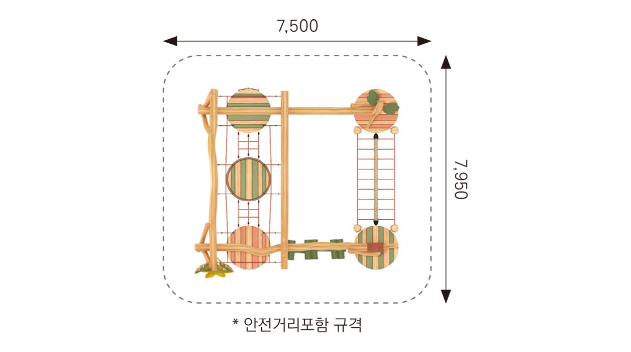 F&K-RO-019(숲속술래잡기놀이대) 안전인증번호 | CA023H074-0059 제품목록으로 바로가기 자료 및 바로가기 나라장터 바로연결 도면 다운로드 시공사진 보러가기 기타 다양한 형태의 흔들 플랫폼과 로프망을 연속적으로 이동하며 친구들과 상호작용하는 술래잡기형 놀이시설입니다. 아이들은 균형을 잡고 빠르게 이동하며 민첩성과 협동심을 자연스럽게 기르게 되며, 숲을 모티브로 한 디자인이 몰입감 있는 모험 놀이공간을 제공합니다. 제품명 F&K-RO-019(숲속술래잡기놀이대) 안전인증번호 | CA023H074-0059 물품식별번호 24050926 규격 4,500 × 4,950 × 3,850(H) 재질 robinia, PP rope F&K-RO-019(숲속술래잡기놀이대) 안전인증번호 | CA023H074-0059 물품식별번호 24050926 규격 4,500 × 4,950 × 3,850(H) 재질 robinia, PP rope 기타 다양한 형태의 흔들 플랫폼과 로프망을 연속적으로 이동하며 친구들과 상호작용하는 술래잡기형 놀이시설입니다. 아이들은 균형을 잡고 빠르게 이동하며 민첩성과 협동심을 자연스럽게 기르게 되며, 숲을 모티브로 한 디자인이 몰입감 있는 모험 놀이공간을 제공합니다. 자료 및 바로가기 나라장터 바로연결 도면 다운로드 시공사진 보러가기